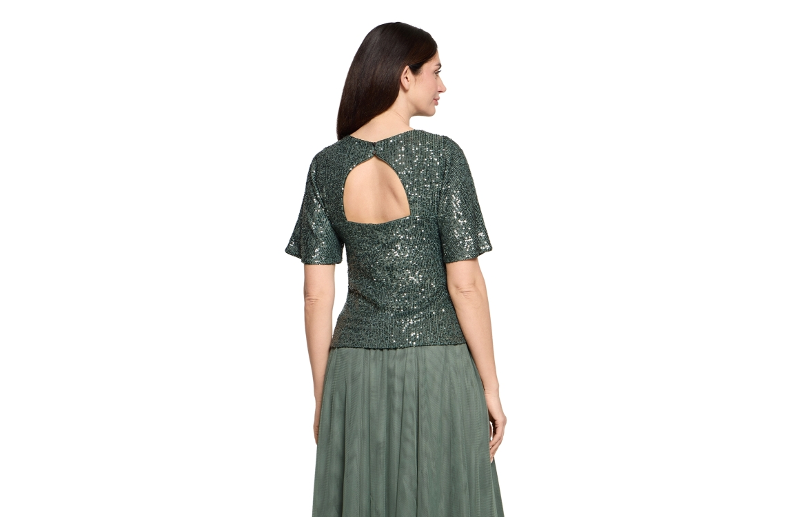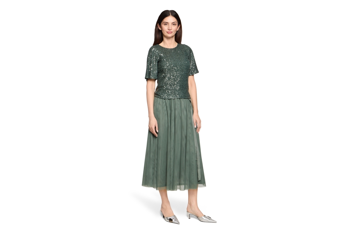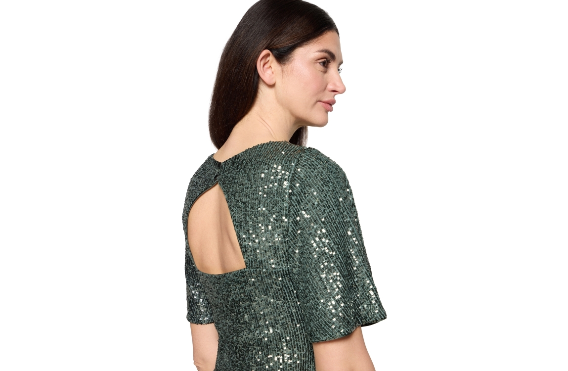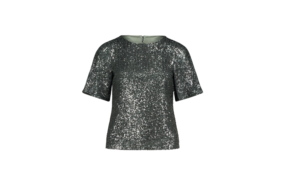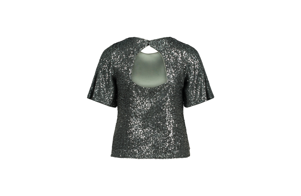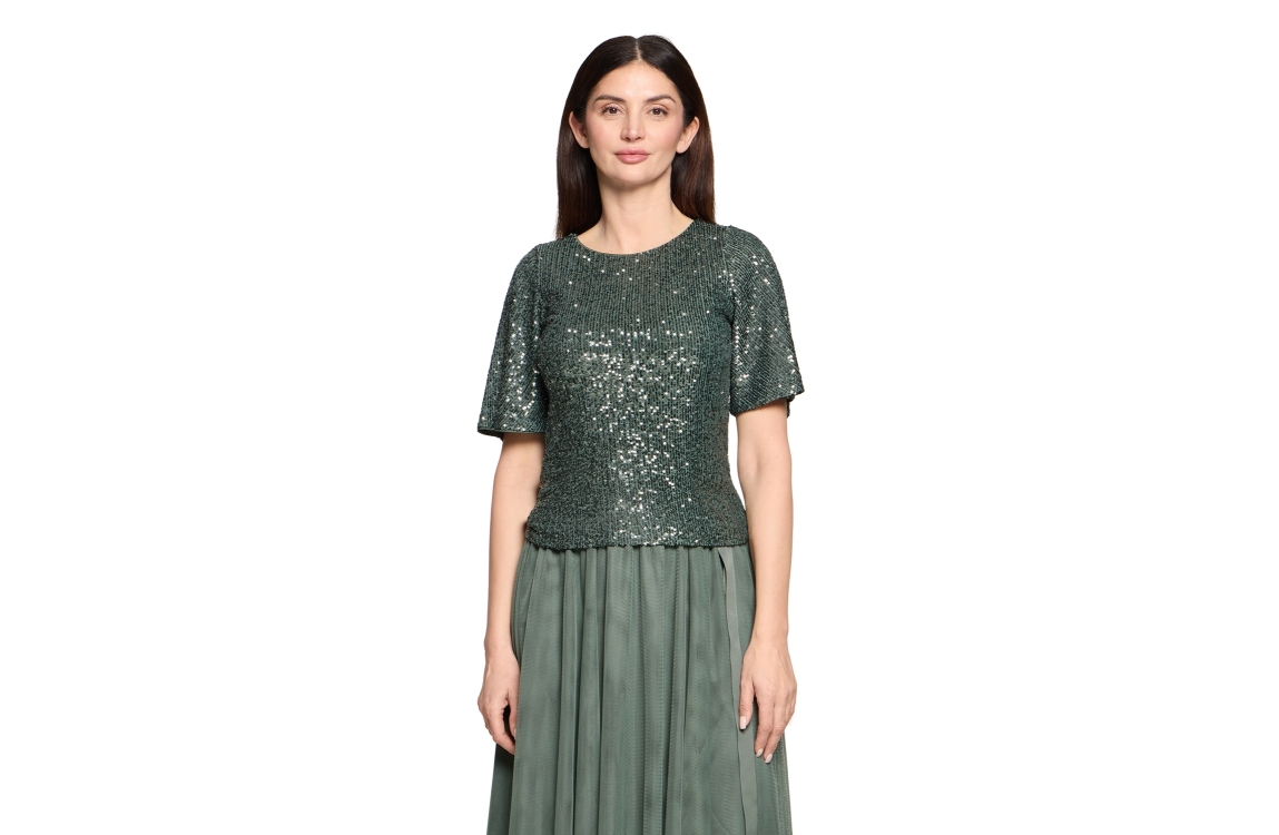 Vera Mont top 03414478. Dit rechtvallende model heeft een ronde hals en korte mouwen. Deze groene top van Vera Mont is voorzien van een open rug en afgewerkt met pailetten.
