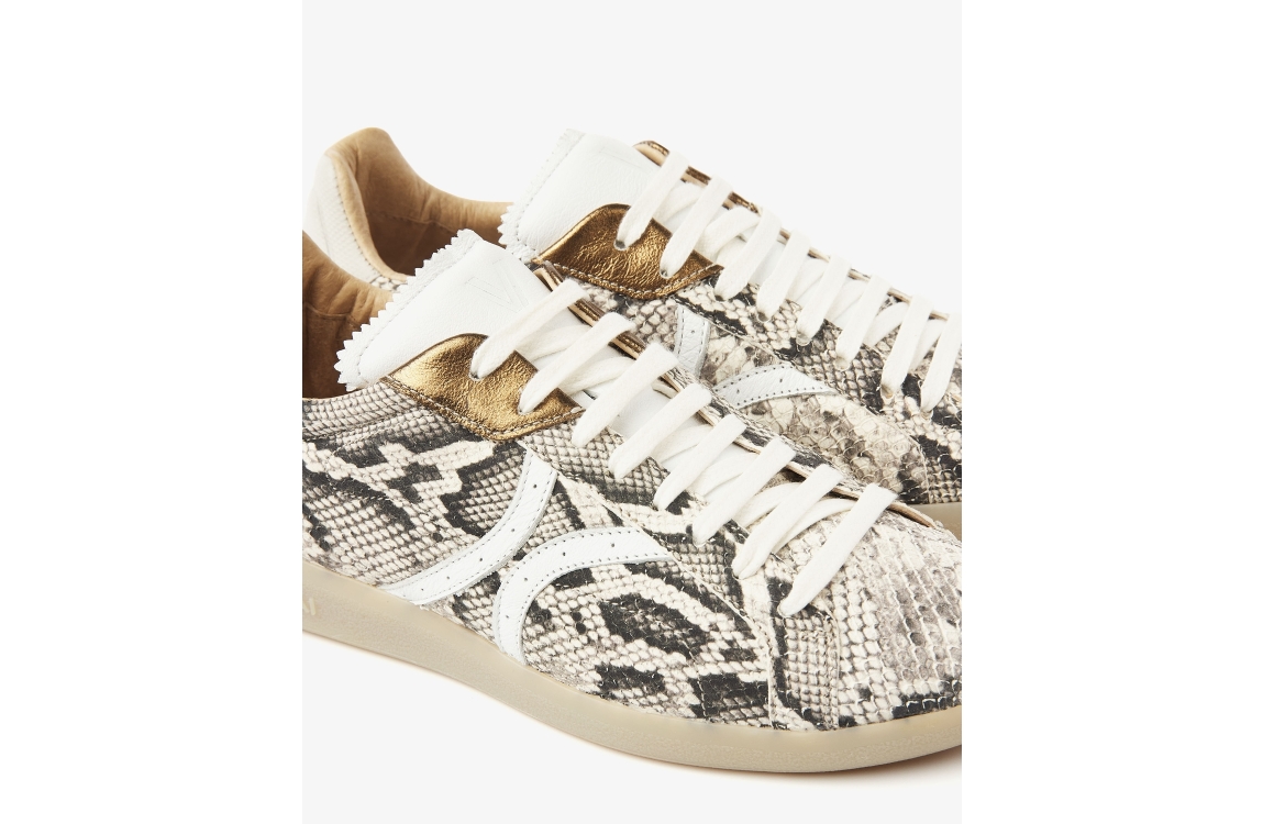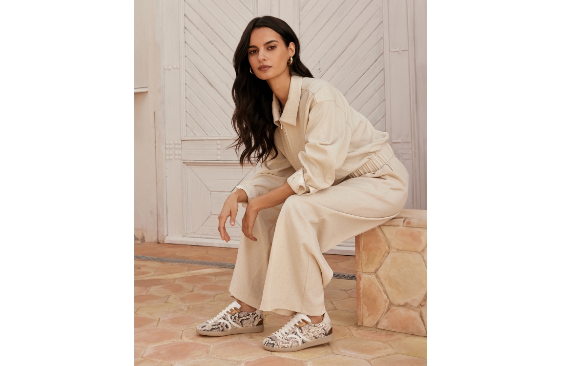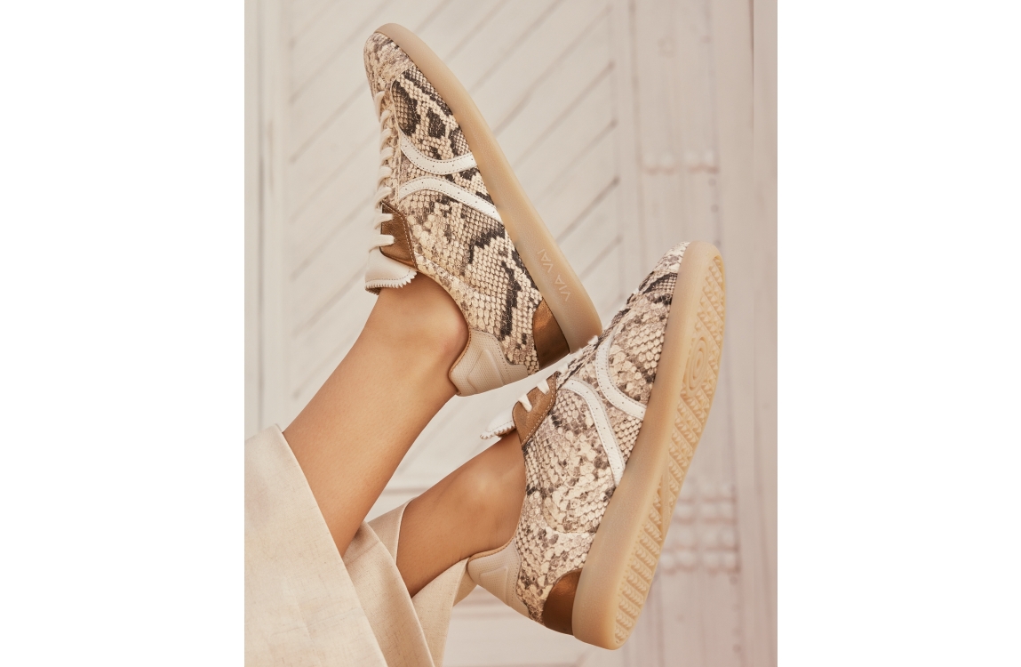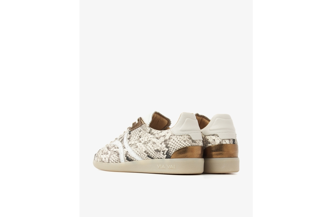 Via Vai sneaker Nilla Khloe 62394. Dit model beschikt over een ronde neus en een platte zool. Deze beige sneaker van Via Vai sluit door middel van veters en is bewerkt met slangenprint en metallic details. De sneaker is gemaakt van een hoogwaardig leer kwaliteit.