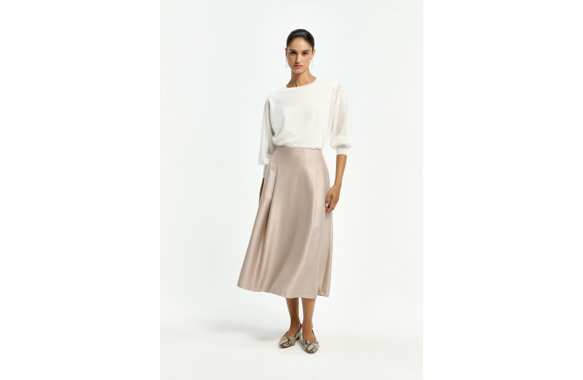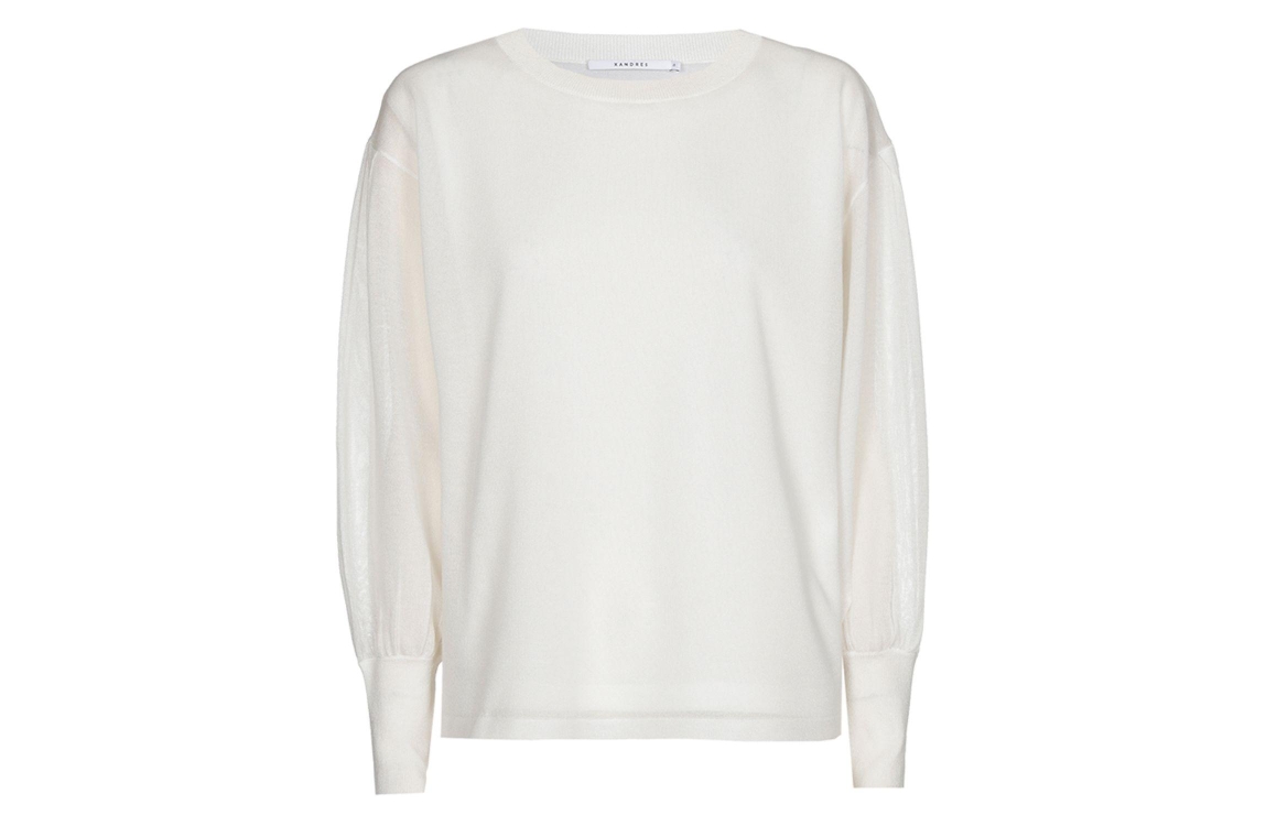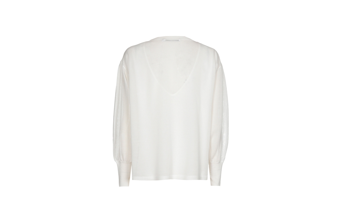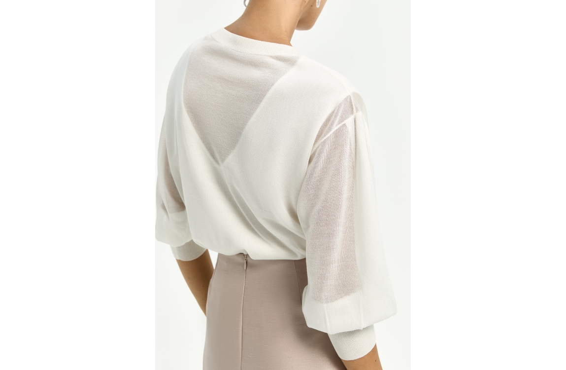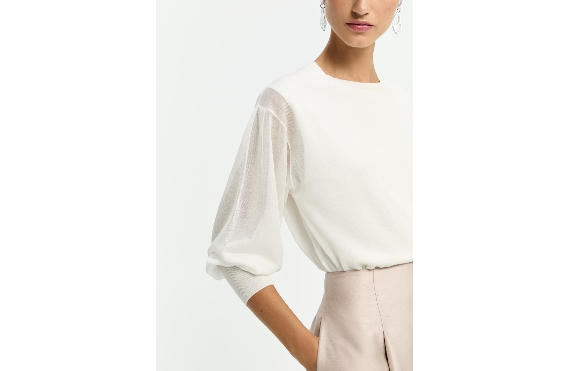 Xandres ALIDE 1841 mount blanc. Dit soepelvallende model is voorzien van een boothals en heeft lange ballonmouwen. Deze gebroken witte trui van Xandres heeft licht transparante mouwen en rug.