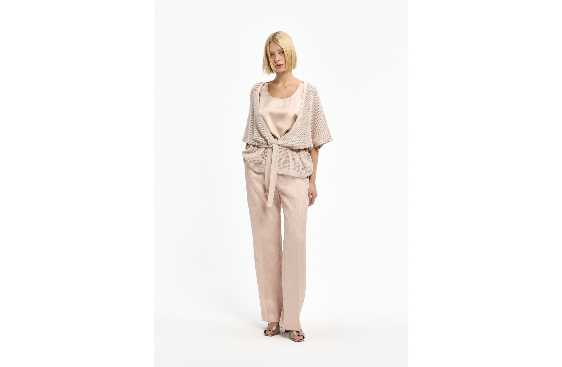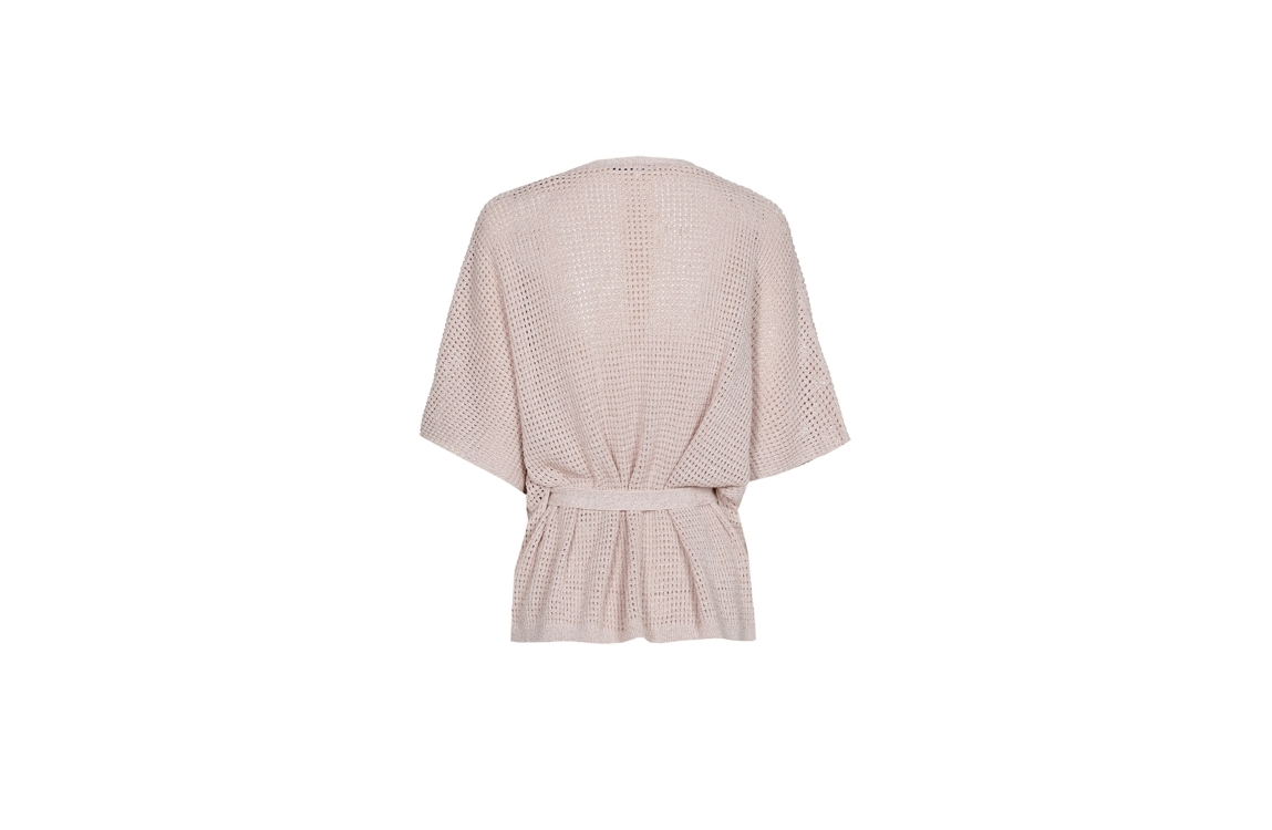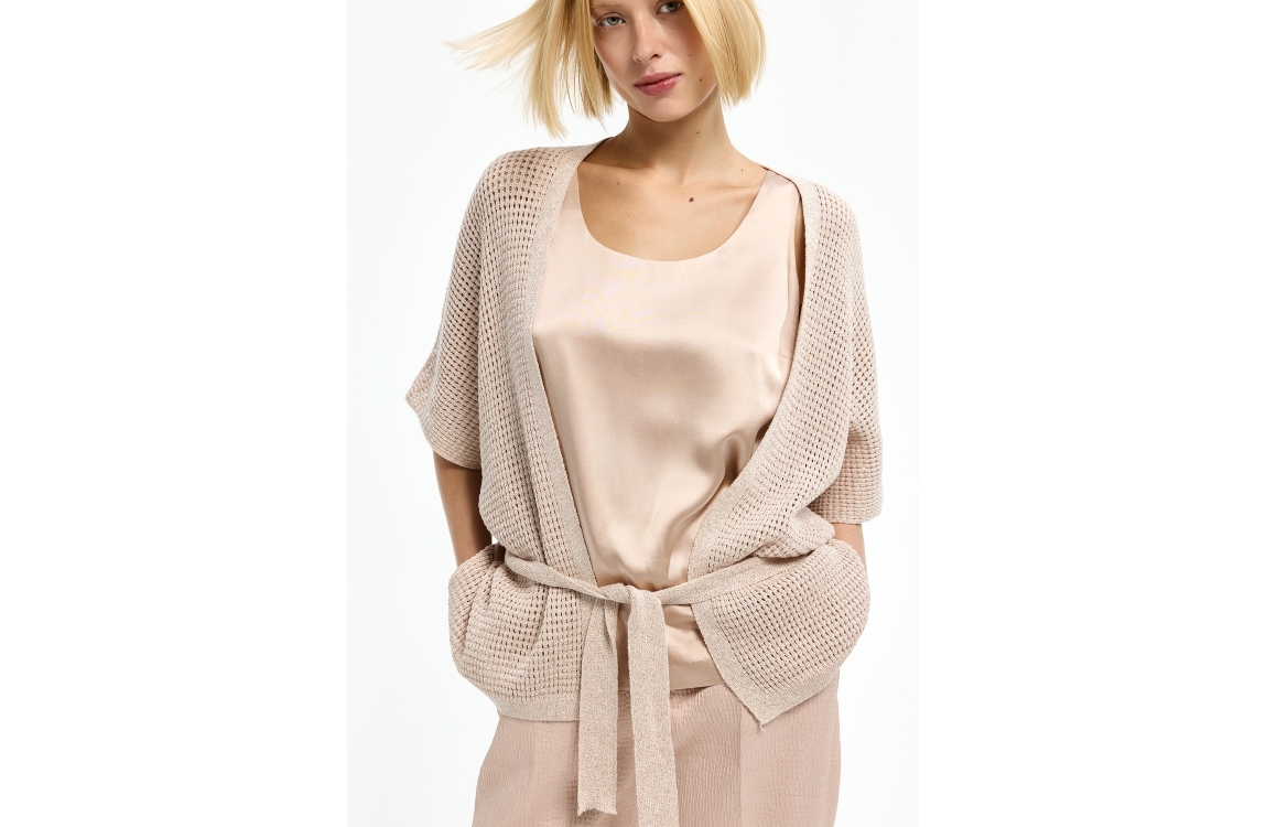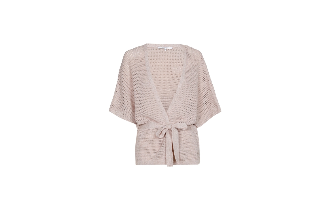 Xandres gilet Binta 29493-01. Dit rechtvallend model is voorzien van een ronde hals en heeft korte mouwen. Deze roze gilet van Xandres sluit door middel van een afneembaar ceintuur en is all-over uitgevoerd in een gehaakt kwaliteit bewerkt met glitter.