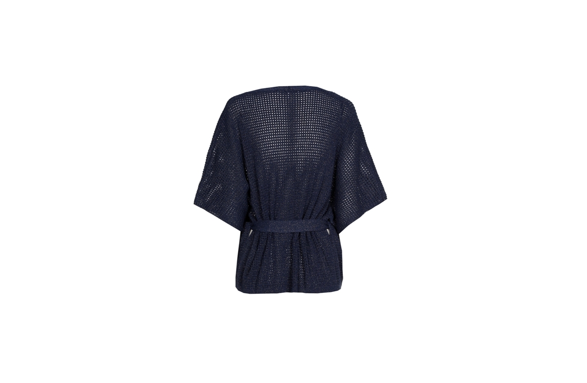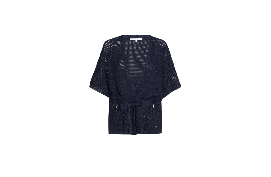 Xandres gilet Binta 29493-01. Dit rechtvallend model is voorzien van een ronde hals en heeft korte mouwen. Deze donkerblauwe gilet van Xandres sluit door middel van een afneembaar ceintuur en is all-over uitgevoerd in een gehaakt kwaliteit bewerkt met glitter.