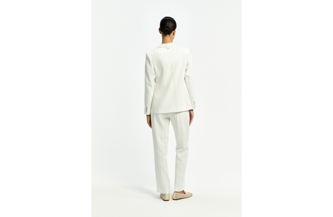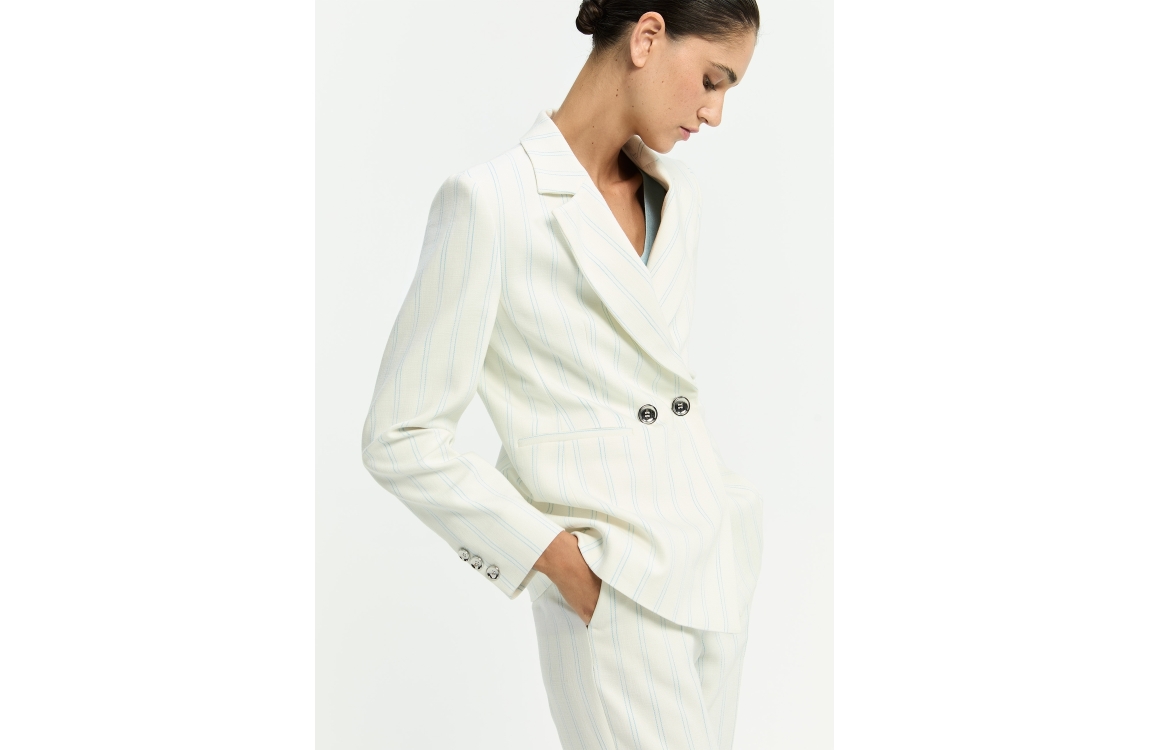 Xandres BLISSO 1845 mount blanc. Dit licht getailleerde model heeft een reverskraag en lange mouwen. Deze gebroken witte blazer van Xandres is all-over bewerkt met elegante krijtstrepen en sluit door middel van zilverkleurige knopen. Dit model kun je als set dragen met een bijpassende broek.