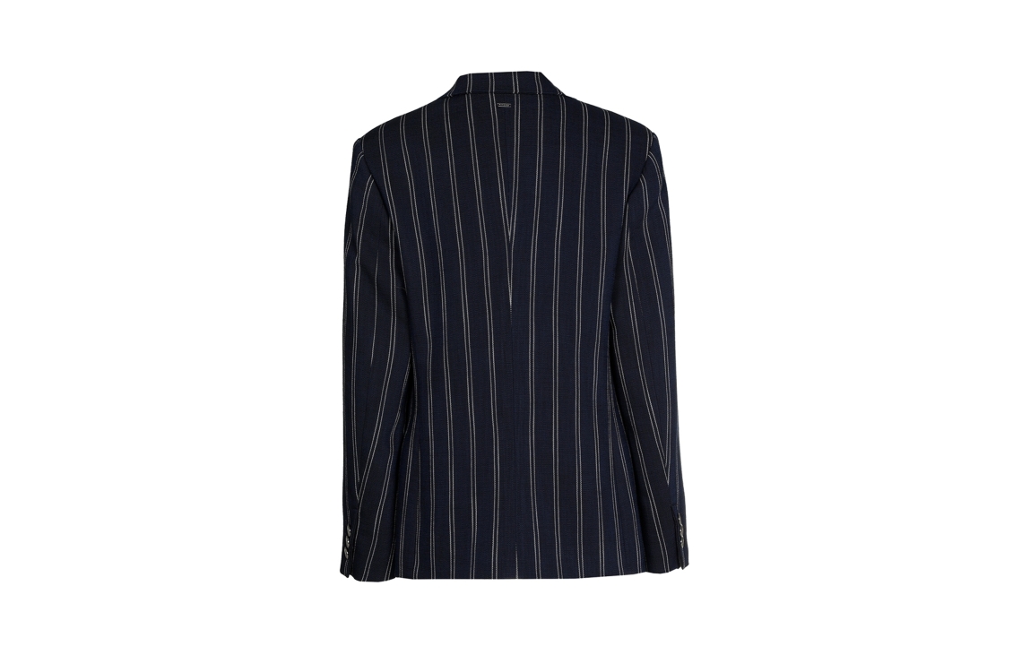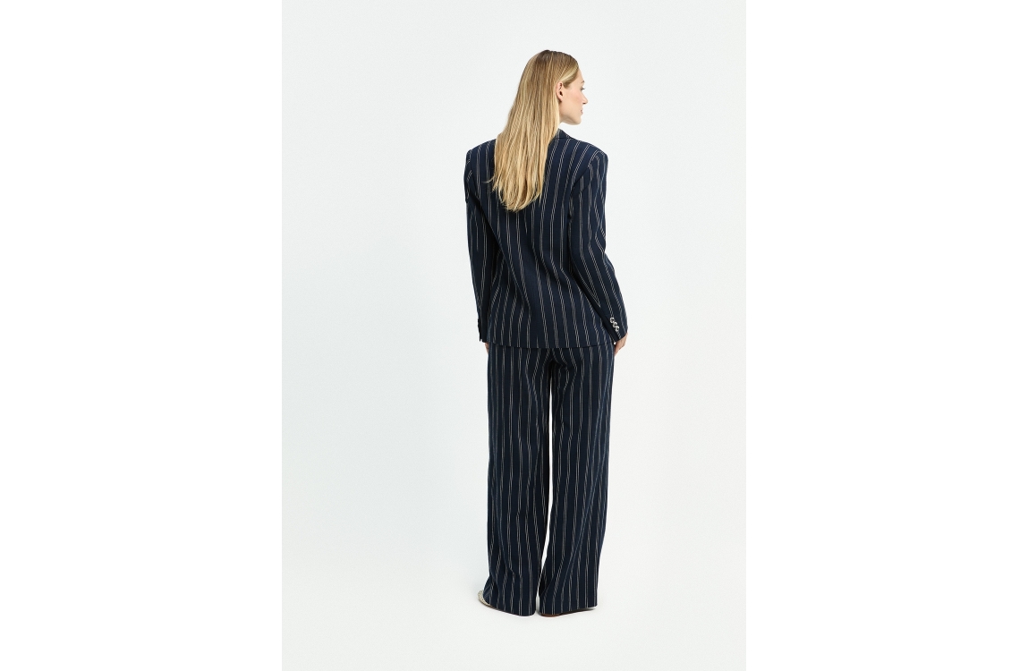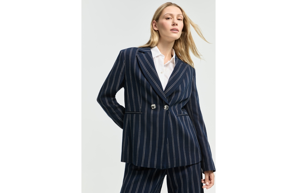 Xandres BLISSO 8805 navy. Dit licht getailleerde model heeft een reverskraag en lange mouwen. Deze donker blauwe blazer van Xandres is all-over bewerkt met elegante krijtstrepen en sluit door middel van zilverkleurige knopen. Dit model kun je als set dragen met een bijpassende broek.