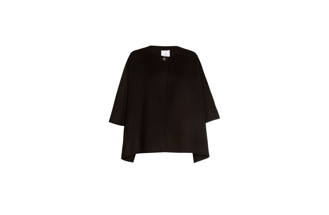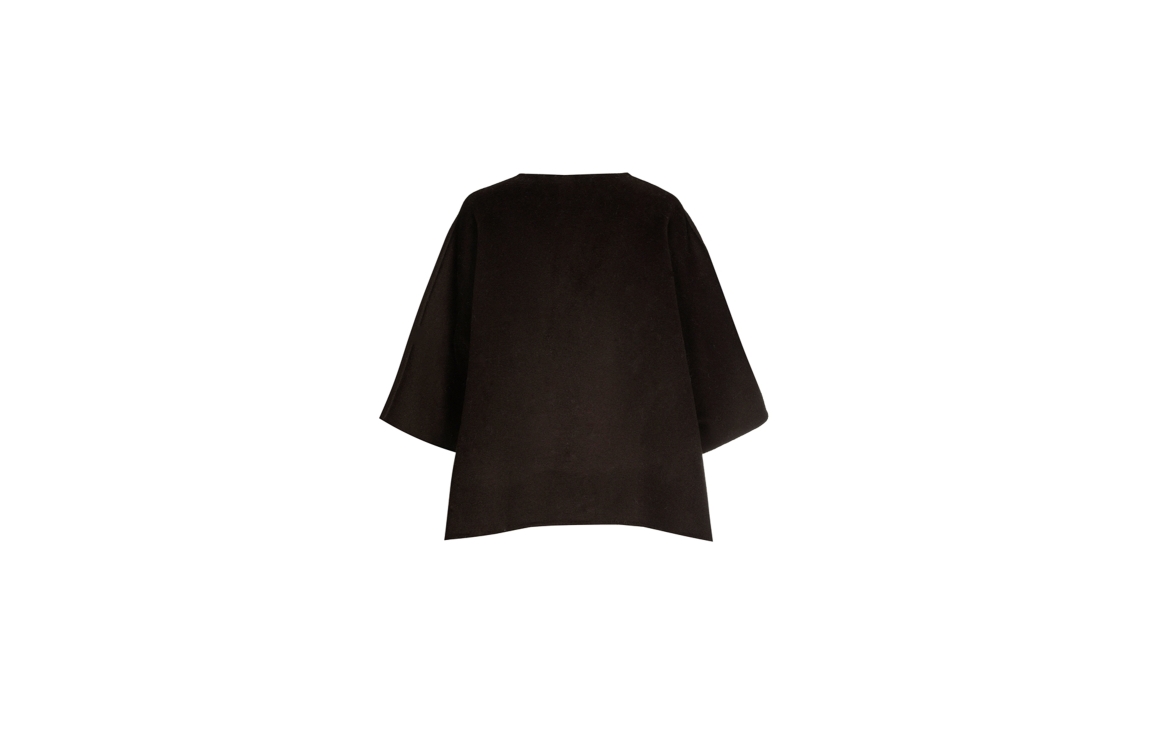 Xandres jas 61486-01. Dit wijdvallende model heeft een ronde halslijn met knoopsluiting en driekwart mouwen. Deze donkerbruine cape van Xandres is gedetailleerd met knopen aan de zijsplitten voor extra draagcomfort.