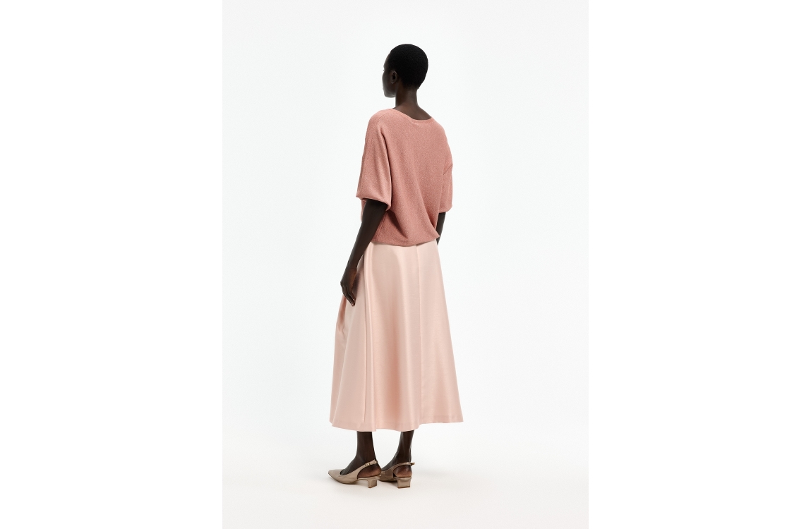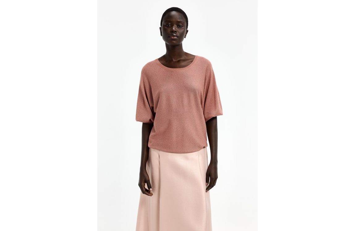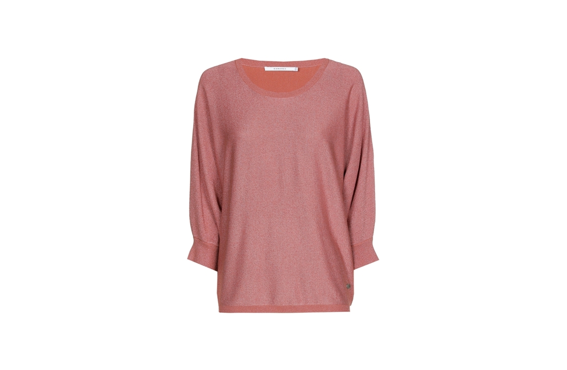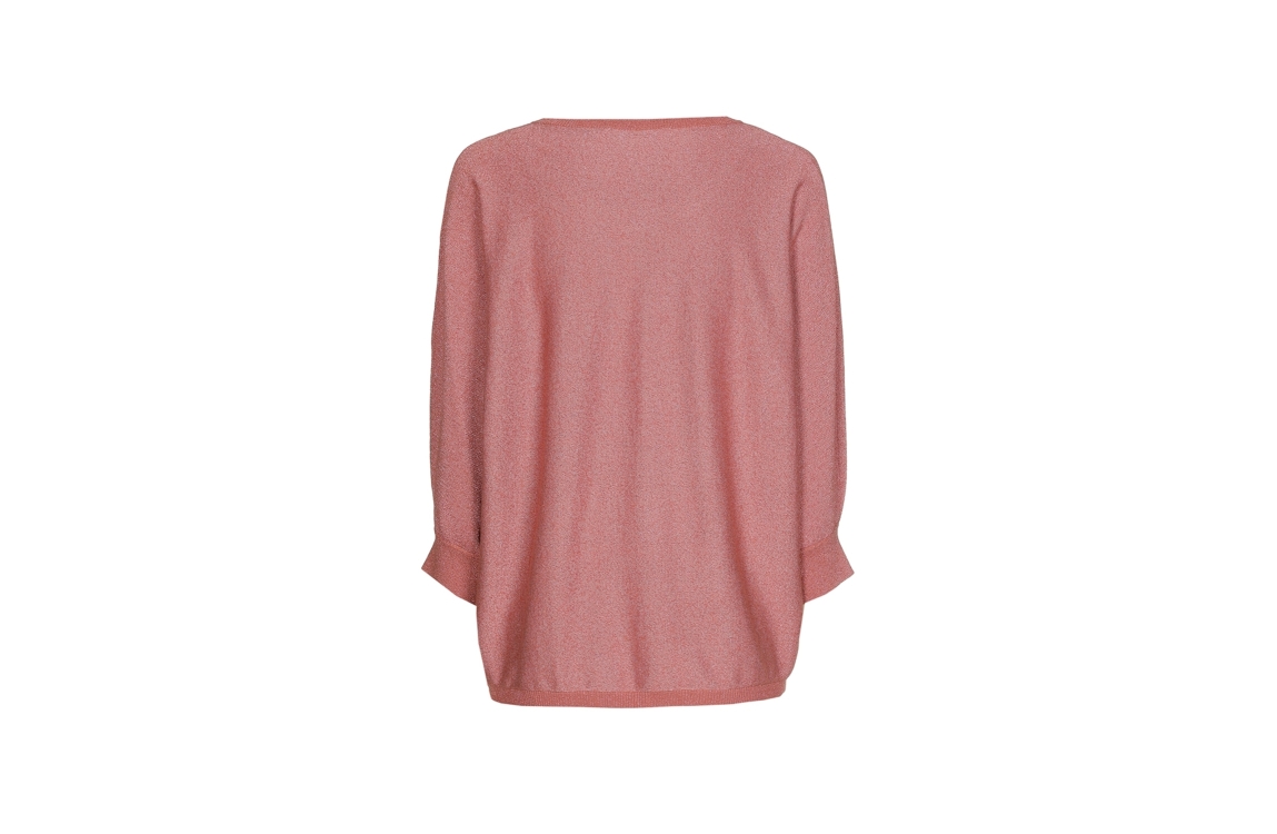 Xandres pullover Gerrett 29008-03. Dit rechtvallend model is voorzien van een ronde hals en heeft driekwart mouwen. Deze roze pullover van Xandres is uitgevoerd met glitter all-over.