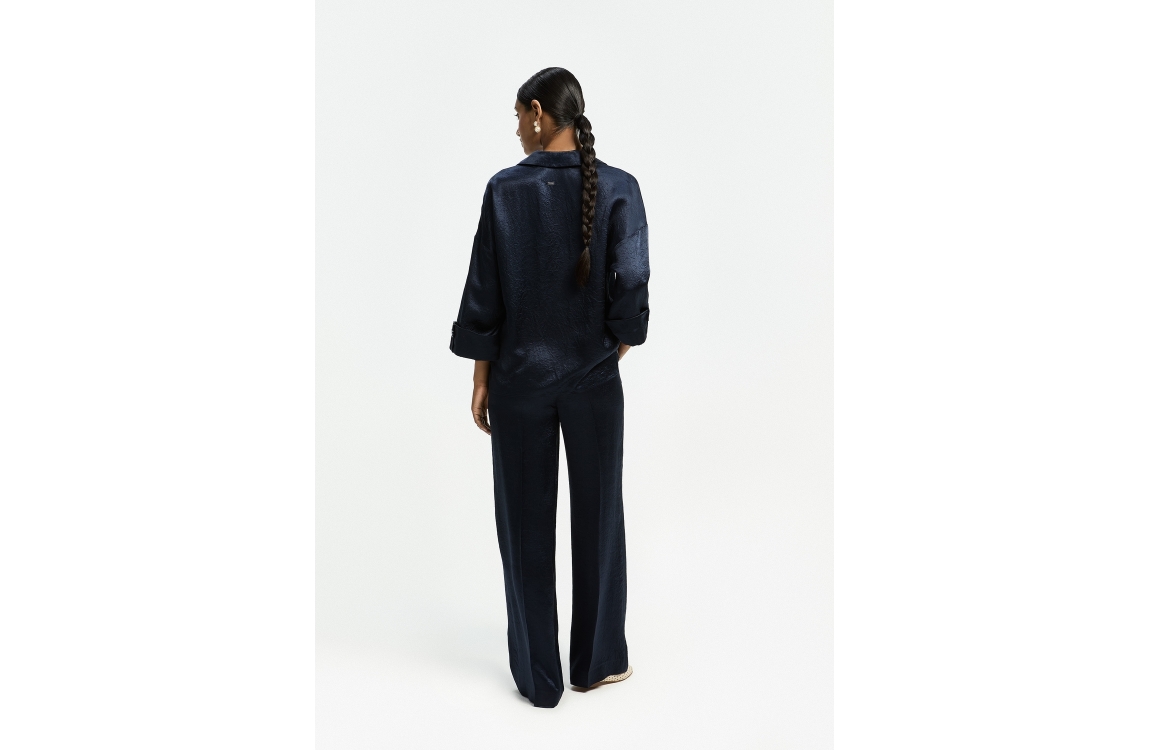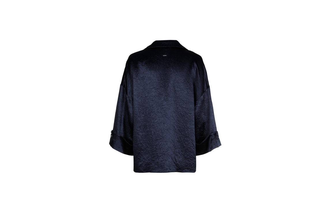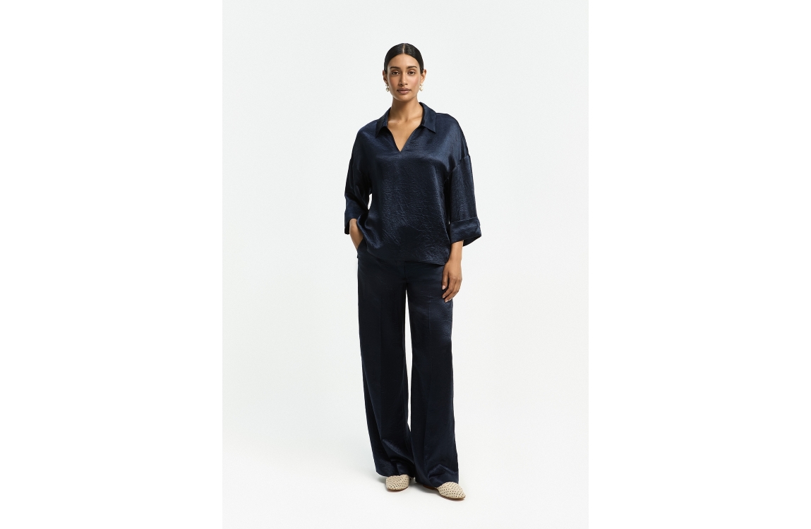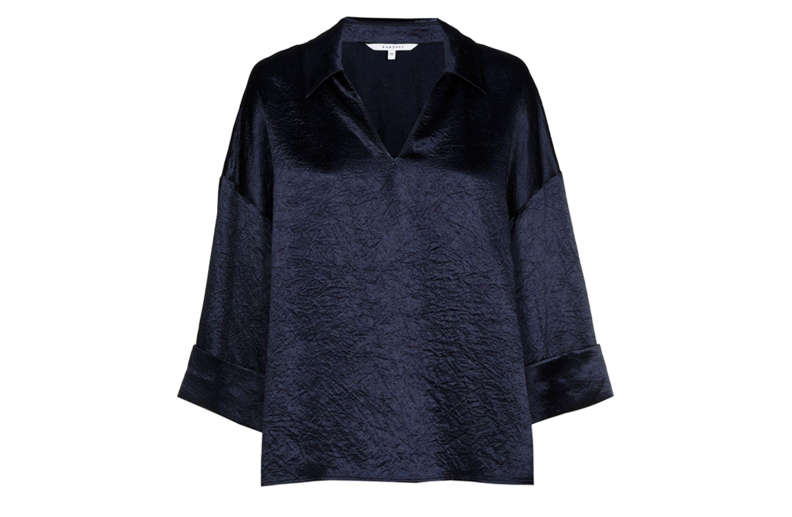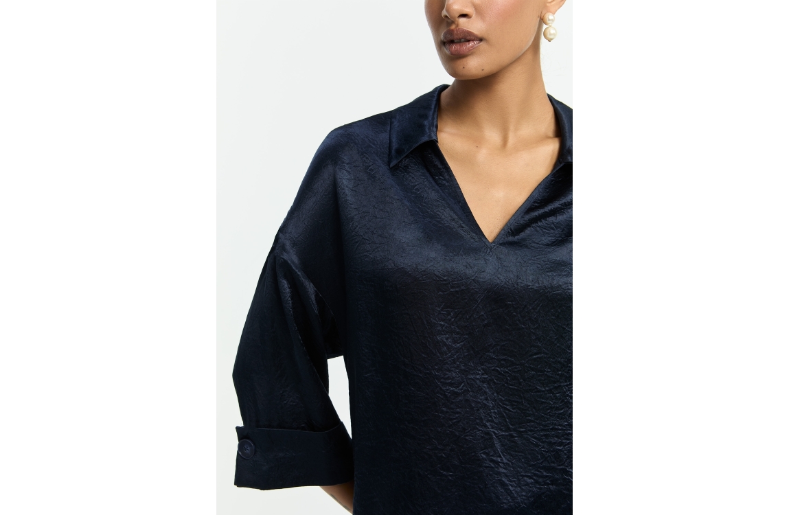 Xandres HALEXA 8801 navy. Dit wijdvallende model is voorzien van een v-hals en wijde driekwart mouwen. Deze donker blauwe blouse van Xandres is uitgevoerd in een glanzende soepelvallende stof.