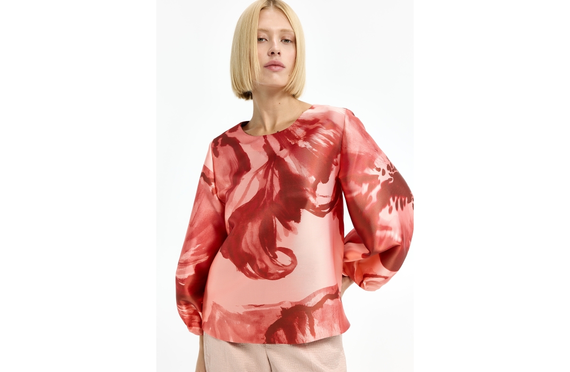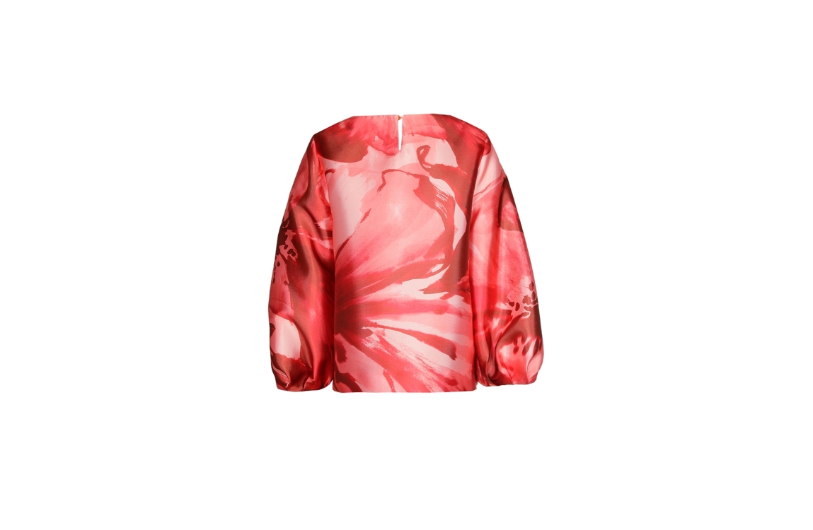 Xandres HANZIE 4065 fluo orange. Dit rechtvallende model is voorzien van een ronde hals en ballonmouwen. Deze oranje blouse van Xandres is all-over bewerkt met een bloemenprint en sluit door middel van een knoop op de achterzijde.