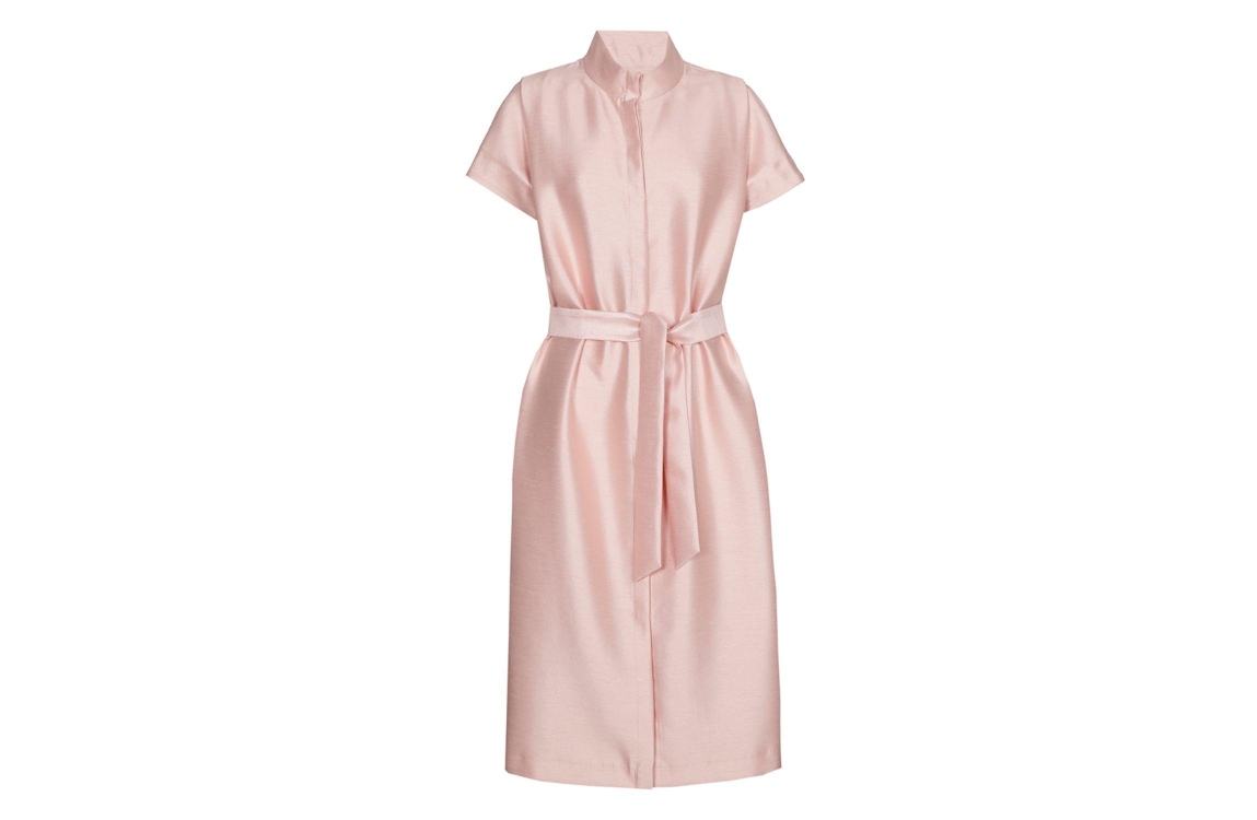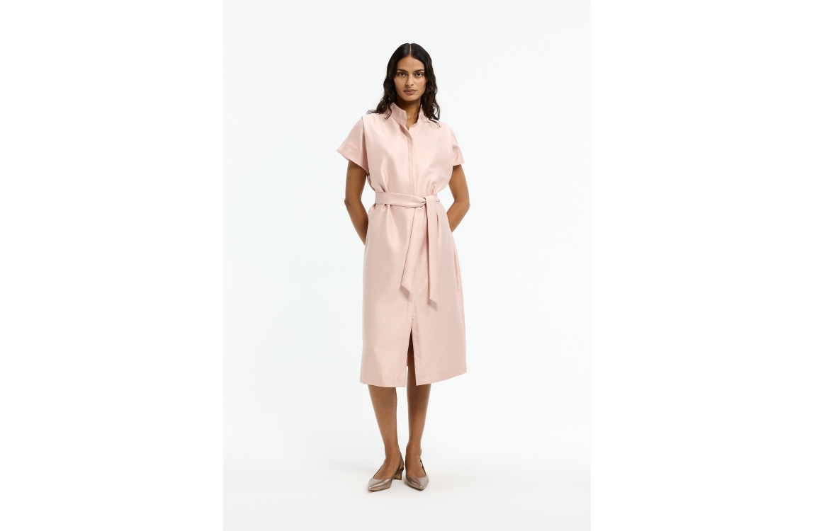 Xandres KOJI 3101 smoky pink. Dit rechtvallende model is voorzien van een opstaande kraag en heeft korte mouwen. Deze roze jurk van Xandres sluit door middel van knopen en een strikceintuur. Dit model is uitgevoerd in een luxe zijden look.