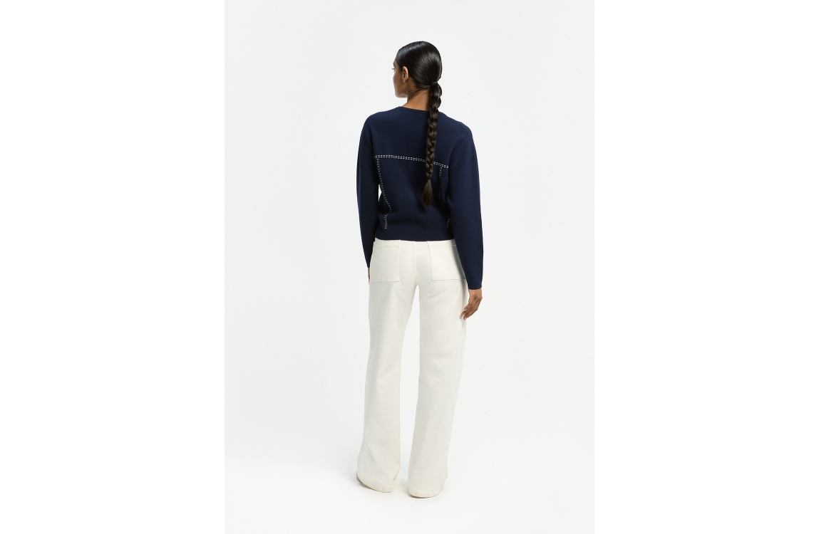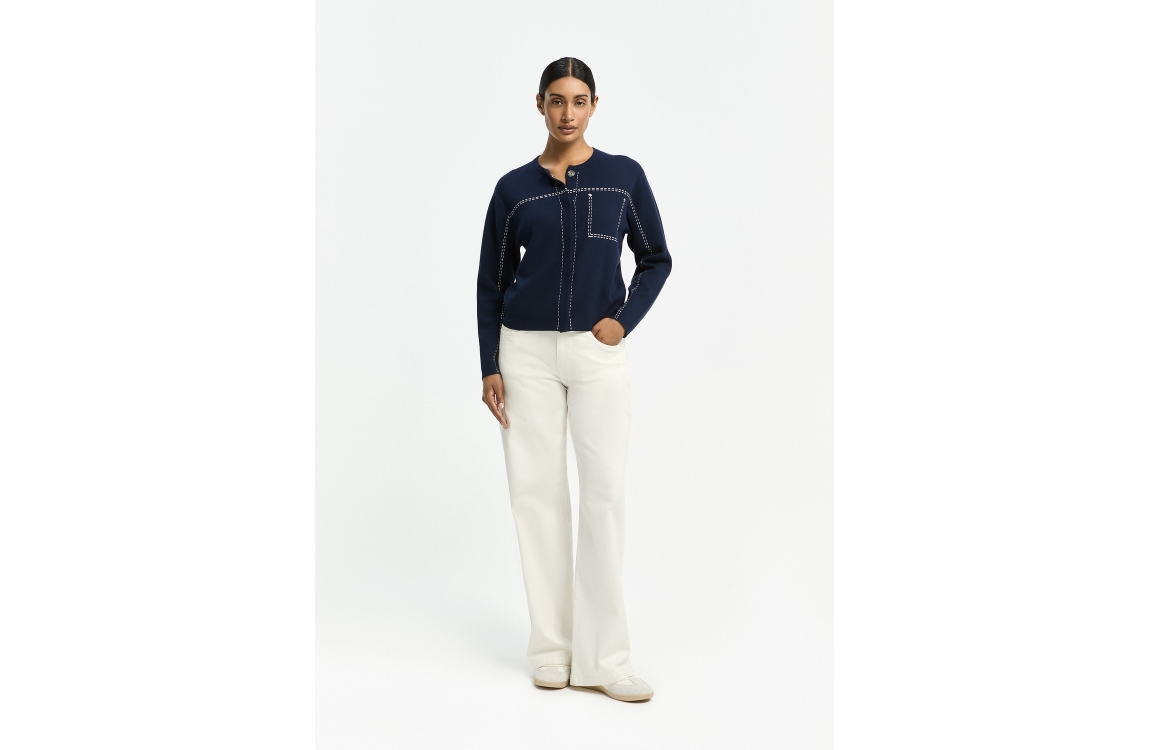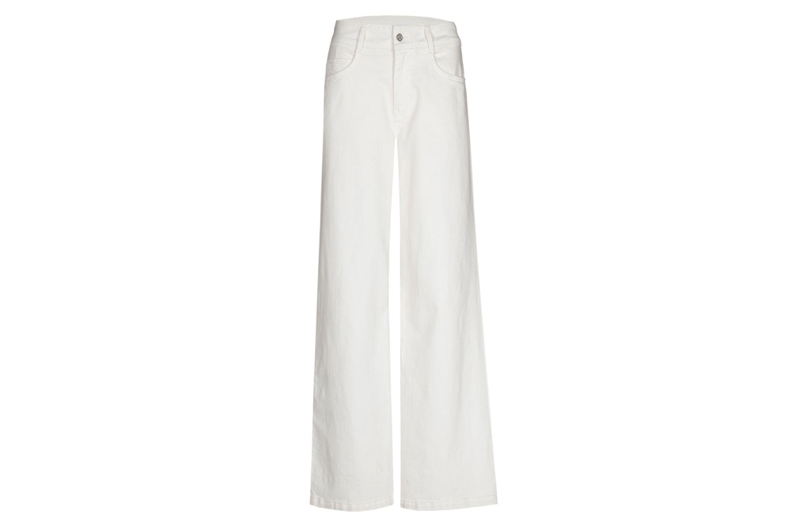 Xandres PETO 1840 mount blanc. Dit rechtvallende model sluit door middel van een knoop en rits afgewerkt met ceintuurlussen. Deze witte denim van Xandres is uitgevoerd in een 5-pocket model en heeft een hoge taille.
