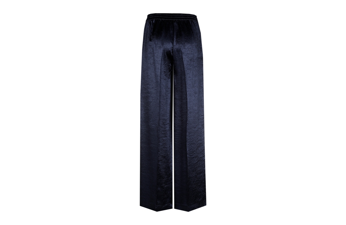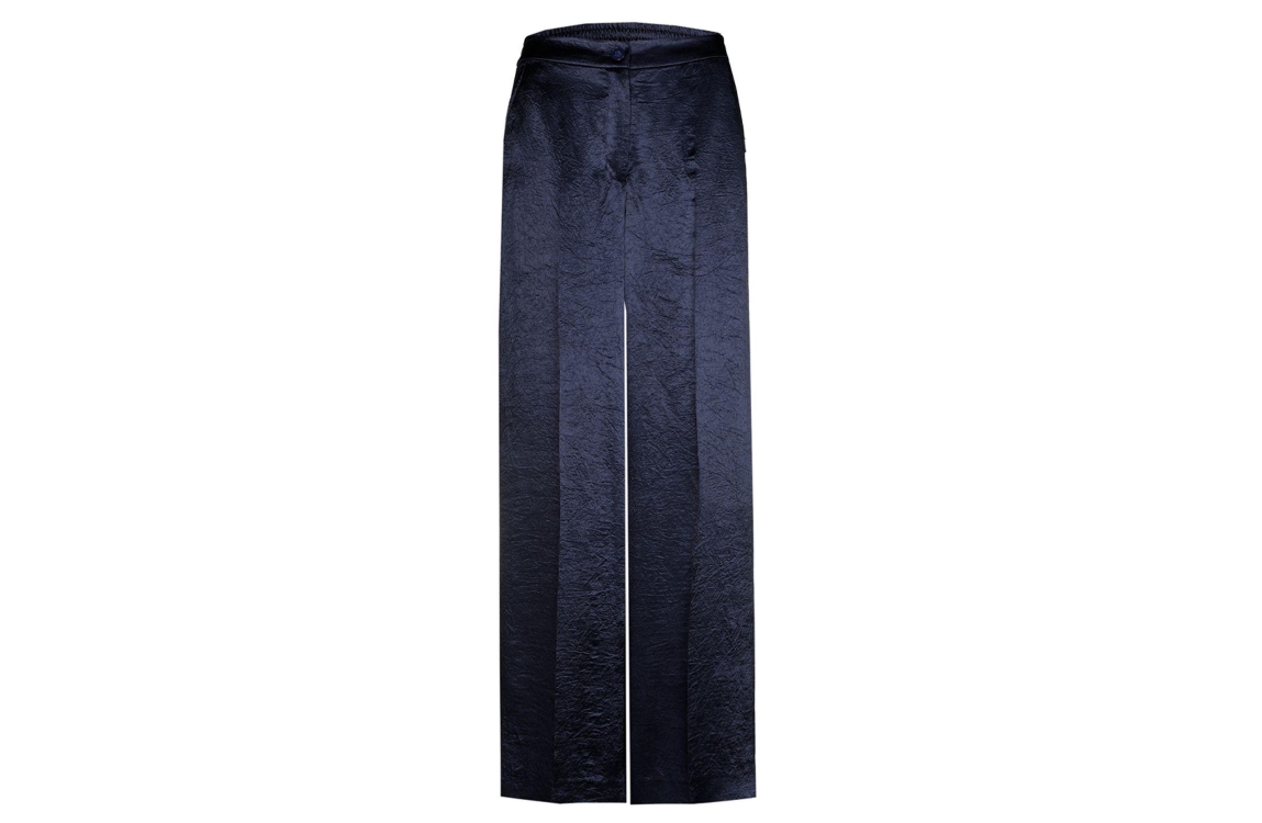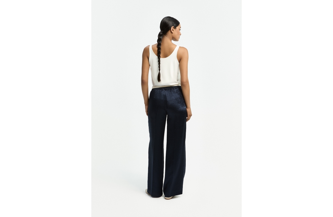 Xandres PHOCOS 8801 navy. Dit wijdvallende model sluit door middel van een knoop- en ritssluiting en beschikt over twee steekzakken aan de voorzijde. Deze donker blauwe pantalon van Xandres is afgewerkt met elastiek in de achterzijde en uitgevoerd in een glazende soepelvallende stof.