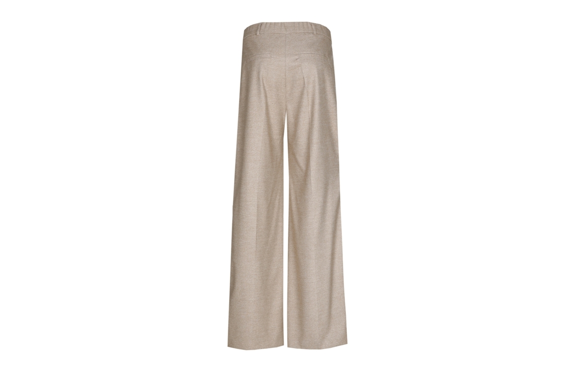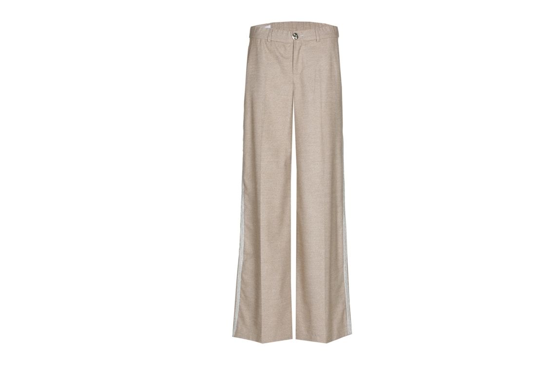 Xandres broek Pierette 14499-01. Dit wide leg model sluit door middel van een sierlijke knoop en rits afgewerkt met ceintuurlussen. Deze beige broek van Xandres beschikt over twee steekzakken aan de voorzijde en twee paspelzakken aan de achterzijde. Dit model is voorzien van glitter boorden aan de zijkant.