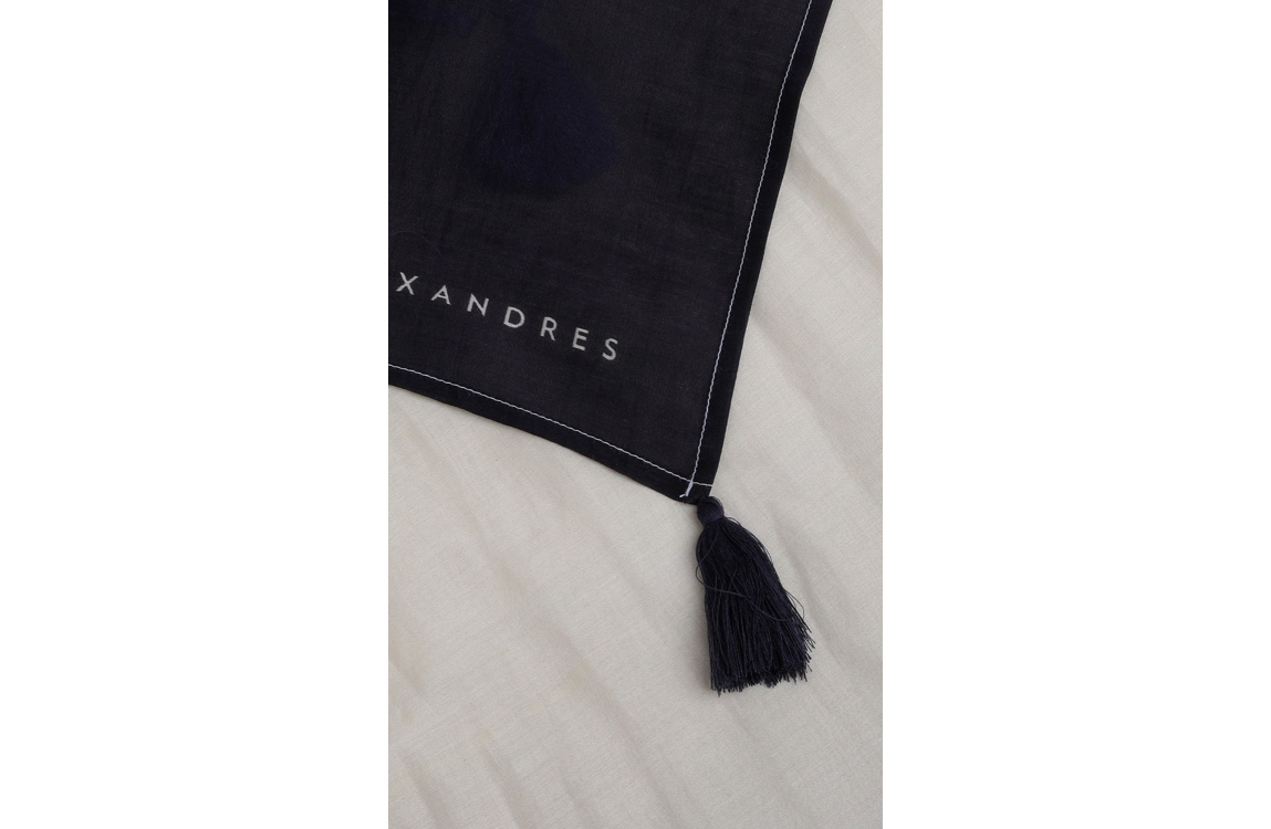 Xandres SCARF_GRADIENT_PRI 8800 navy. Dit rechthoekig model is bewerkt met verschillende kleuren en afgewerkt met fronsjes aan de hoeken.