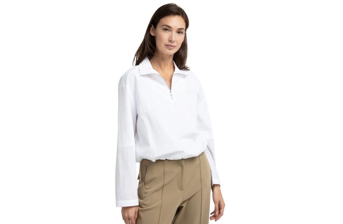 Yaya blouse 01-701360-602 00000. Dit loose fit model heeft een polokraag met ritssluiting en lange mouwen. Deze witte blouse van Yaya is voorzien van een ballonvormige zoom voor een sportieve look en is afgewerkt met manchetten.
