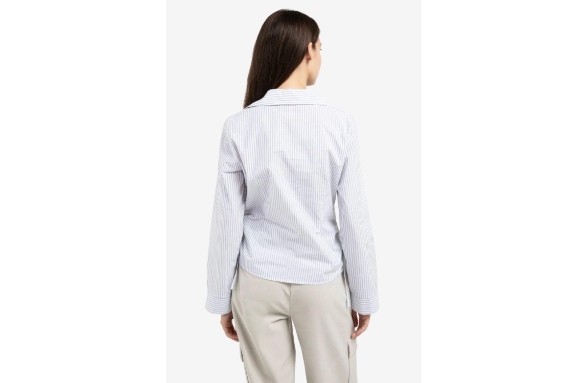 Yaya blouse 01-201203-602. Dit rechtvallend model is voorzien van een kraag en heeft lange mouwen afgewerkt met splitjes. Deze grijs/wit gestreepte blouse van Yaya sluit door middel van knopen en is aan de zijkanten voorzien van koordjes voor een draperie effect.