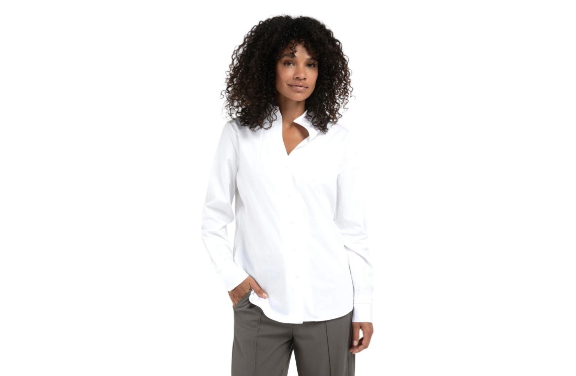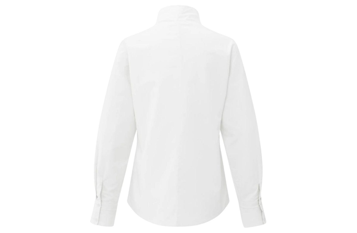 Yaya blouse 01-201181-510 00000. Dit rechtvallende model heeft een opstaande kraag met V-inkeping en lange mouwen. Deze off-white blouse van Yaya sluit aan de voorzijde door middel van knopen en heeft afgewerkte manchetten.