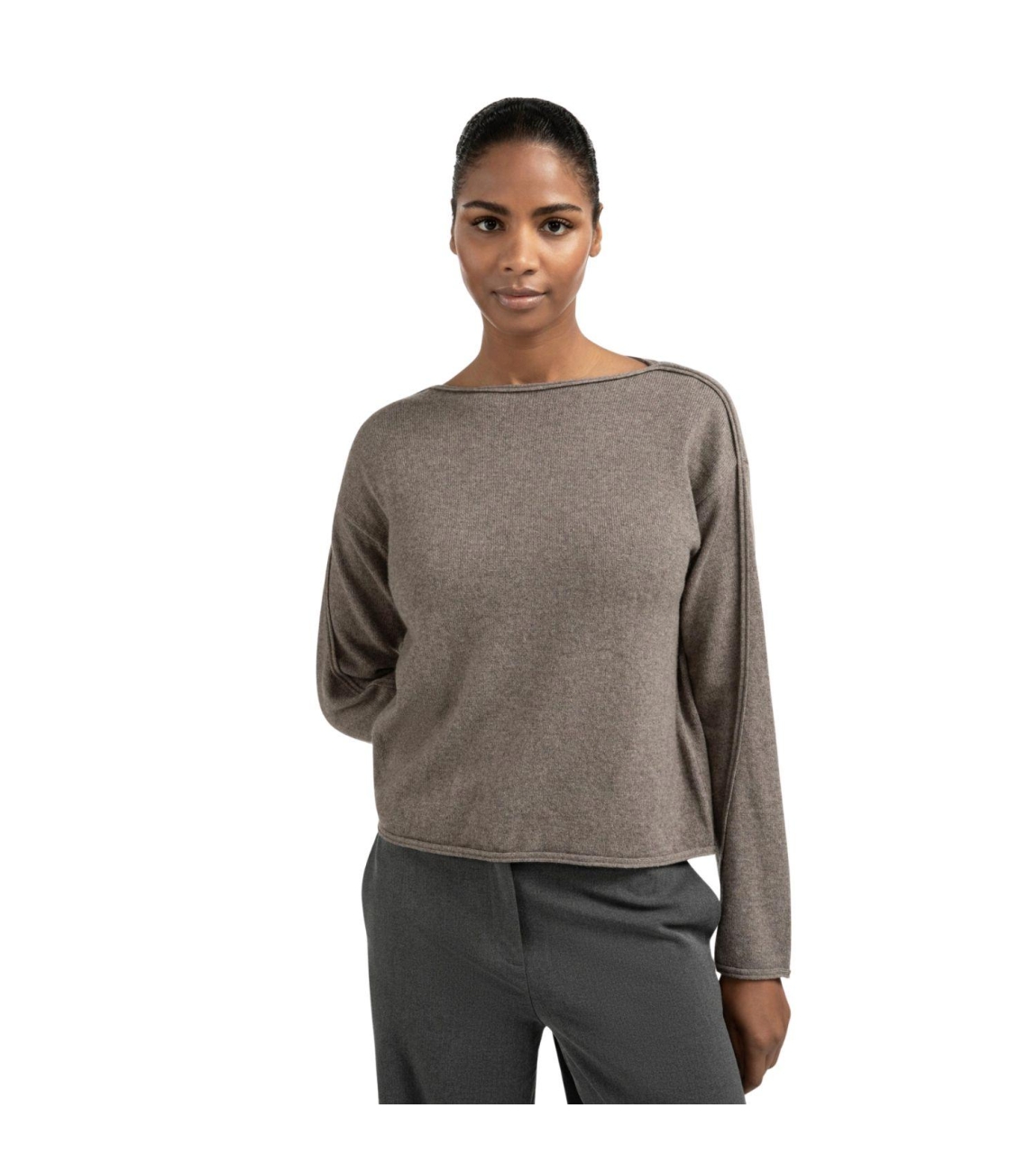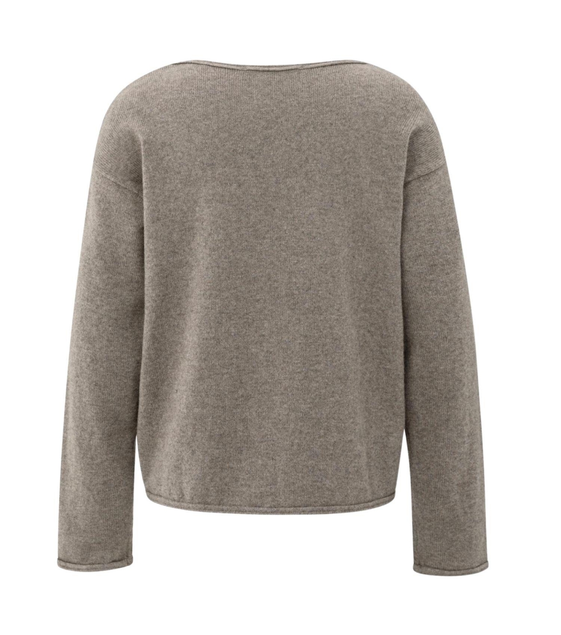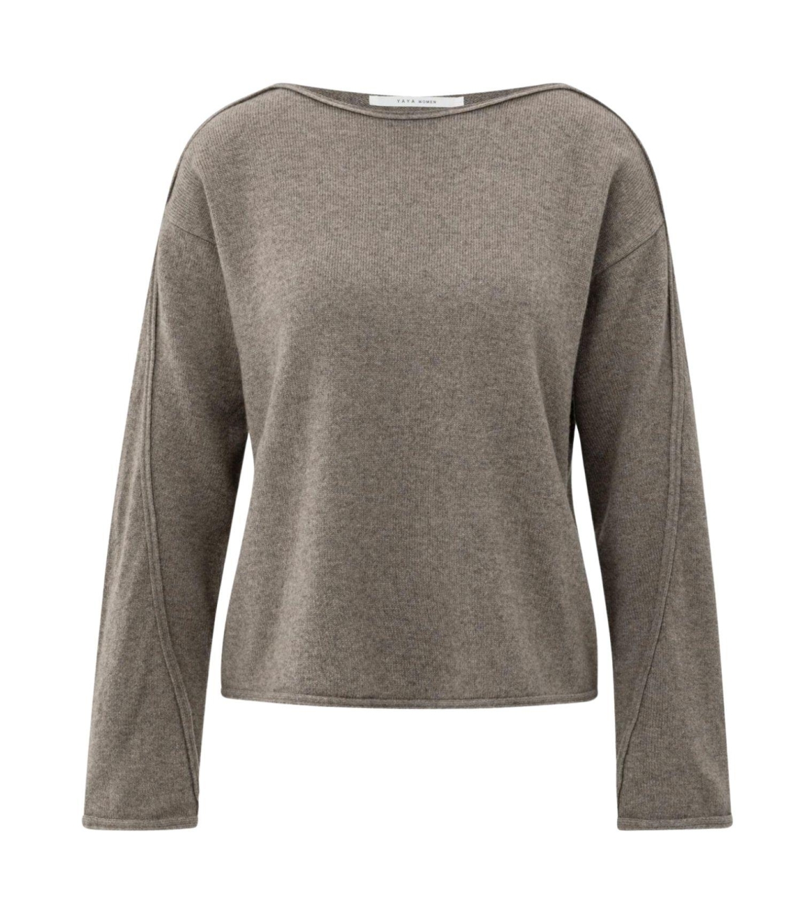 Yaya sweater 01-000489-509. Dit rechtvallende model heeft een boothals en lange mouwen. Deze bruine sweater van Yaya is afgewerkt met verfijnde siernaden over de mouwen en heeft een comfortabele pasvorm.