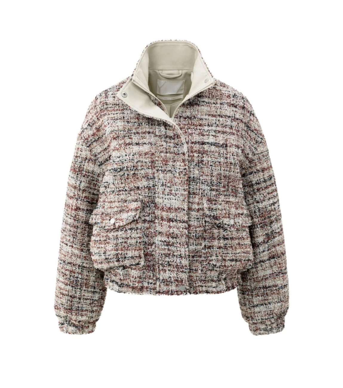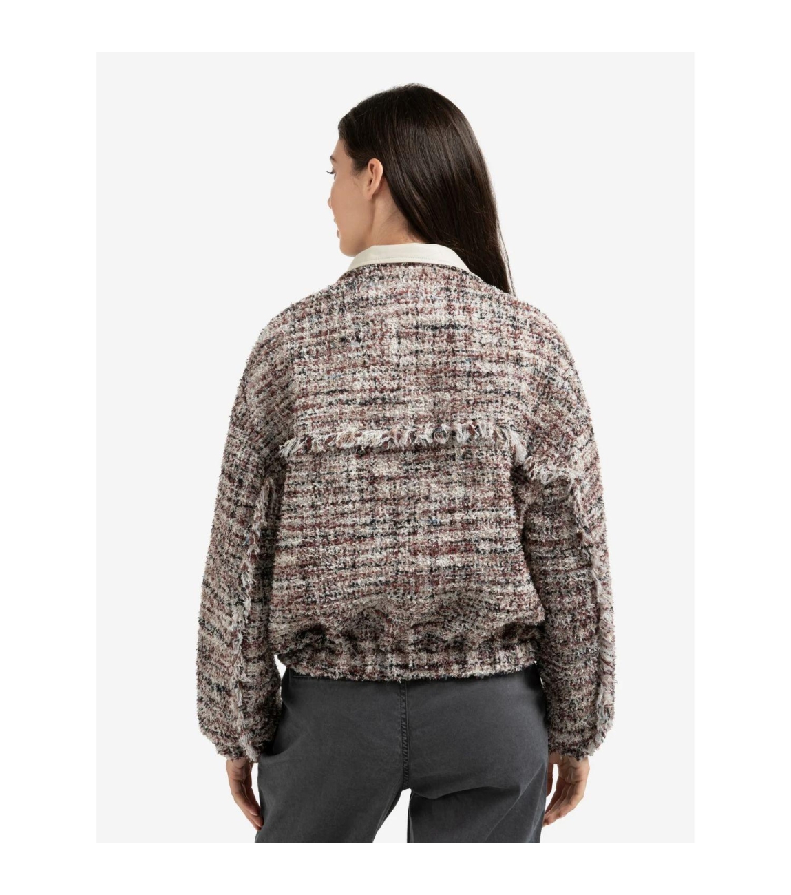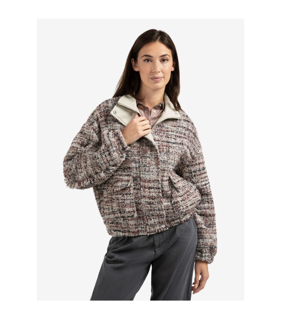 Yaya Boucle jacket with fringes 990161 Blush pink dessin. Dit rechtvallende model is voorzien van een opstaande kraag en heeft lange mouwen. Dit burgundy multi colour bomber jasje van Yaya sluit aan de voorzijde door middel van een rits. Dit model is uitgevoerd in een boucle stof.
