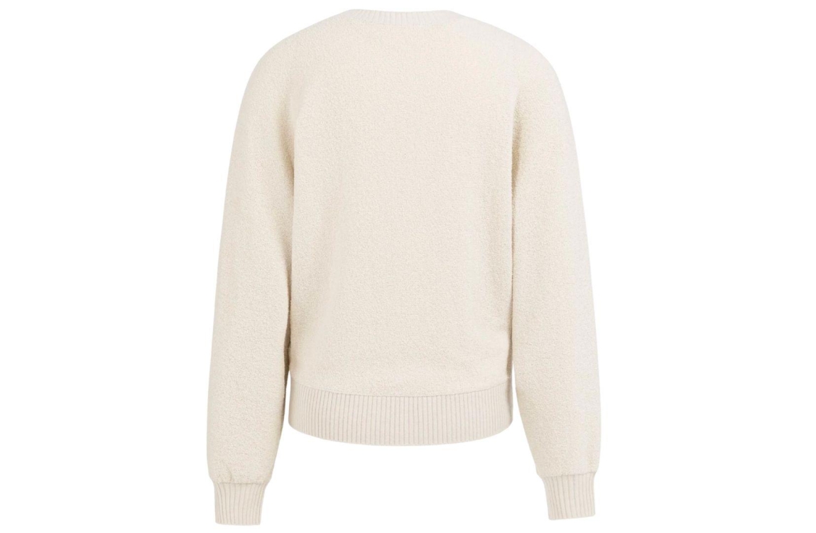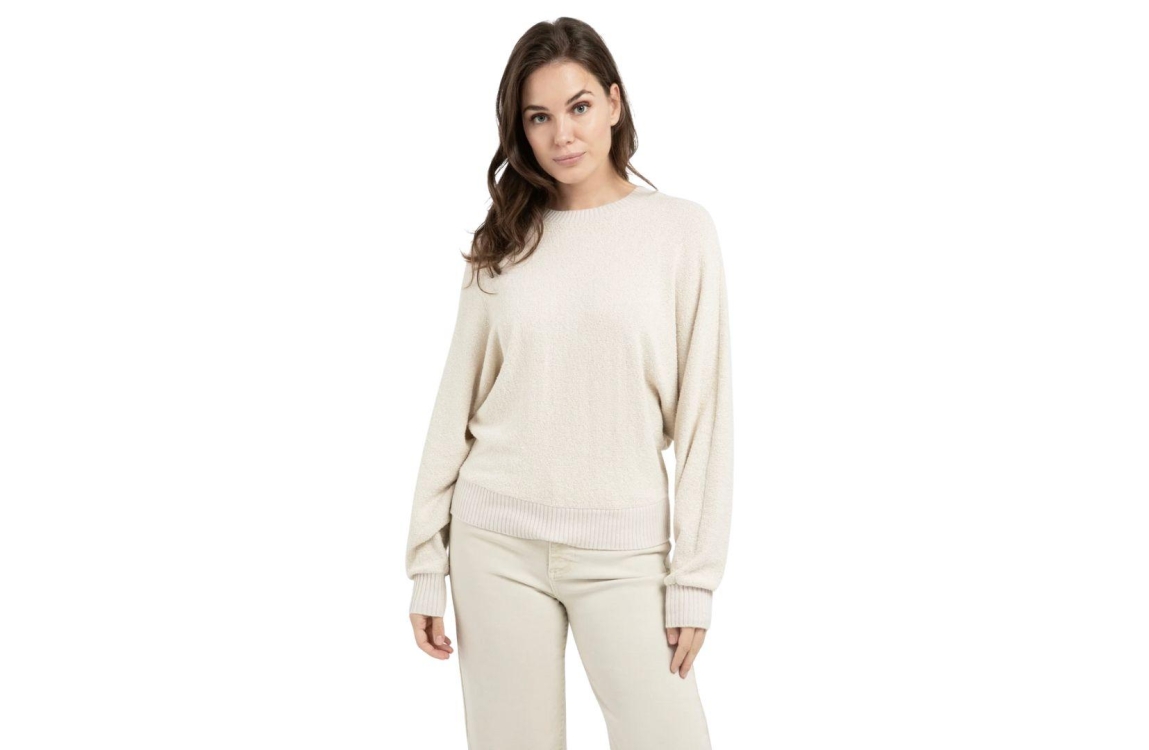 Yaya pullover 01-000554-602 99044. Dit soepelvallende model heeft een ronde halslijn en lange vleermuismouwen. Deze beige pullover van Yaya is uitgevoerd met een boucléstructuur en is afgewerkt met ribgebreide boorden.