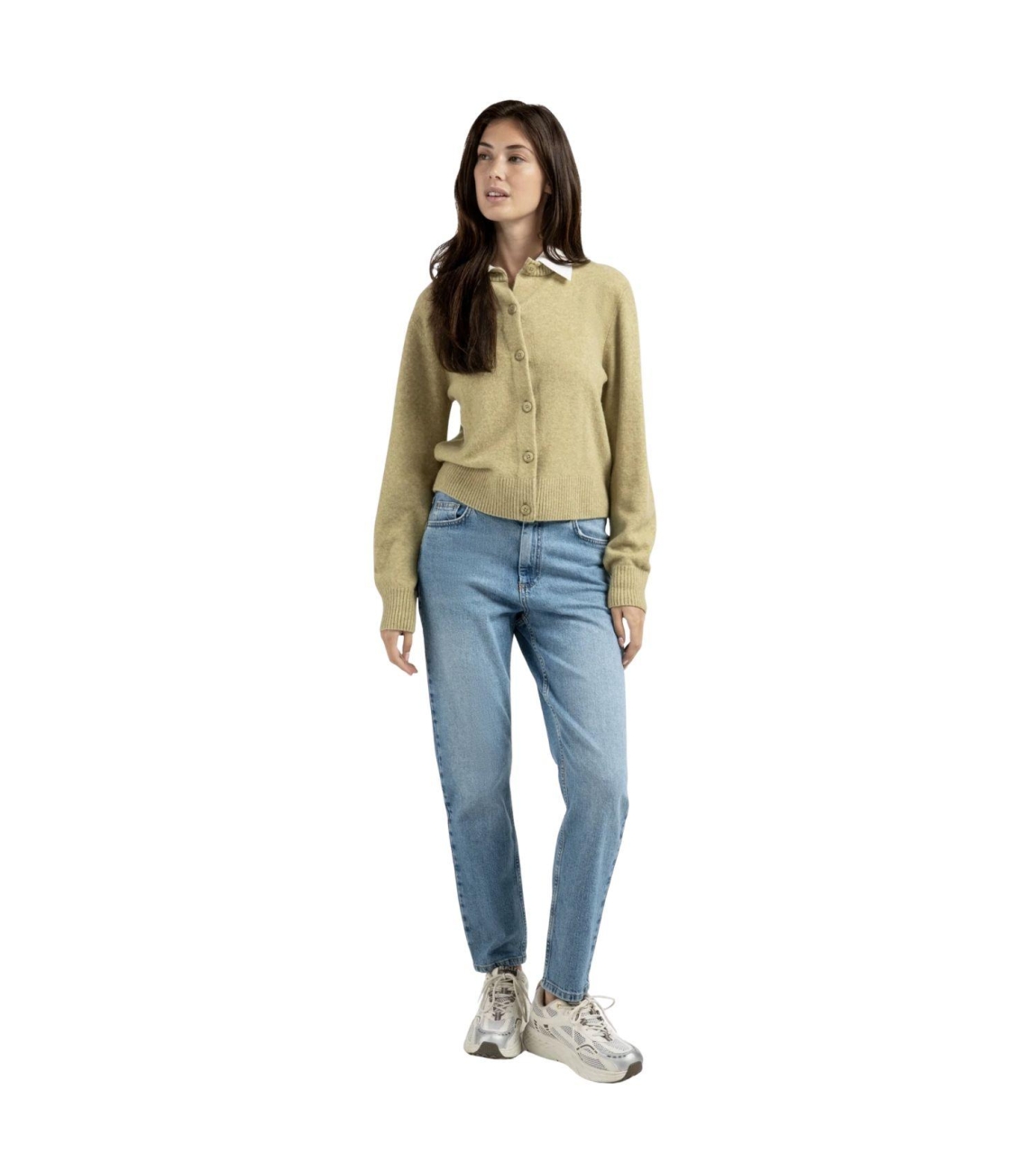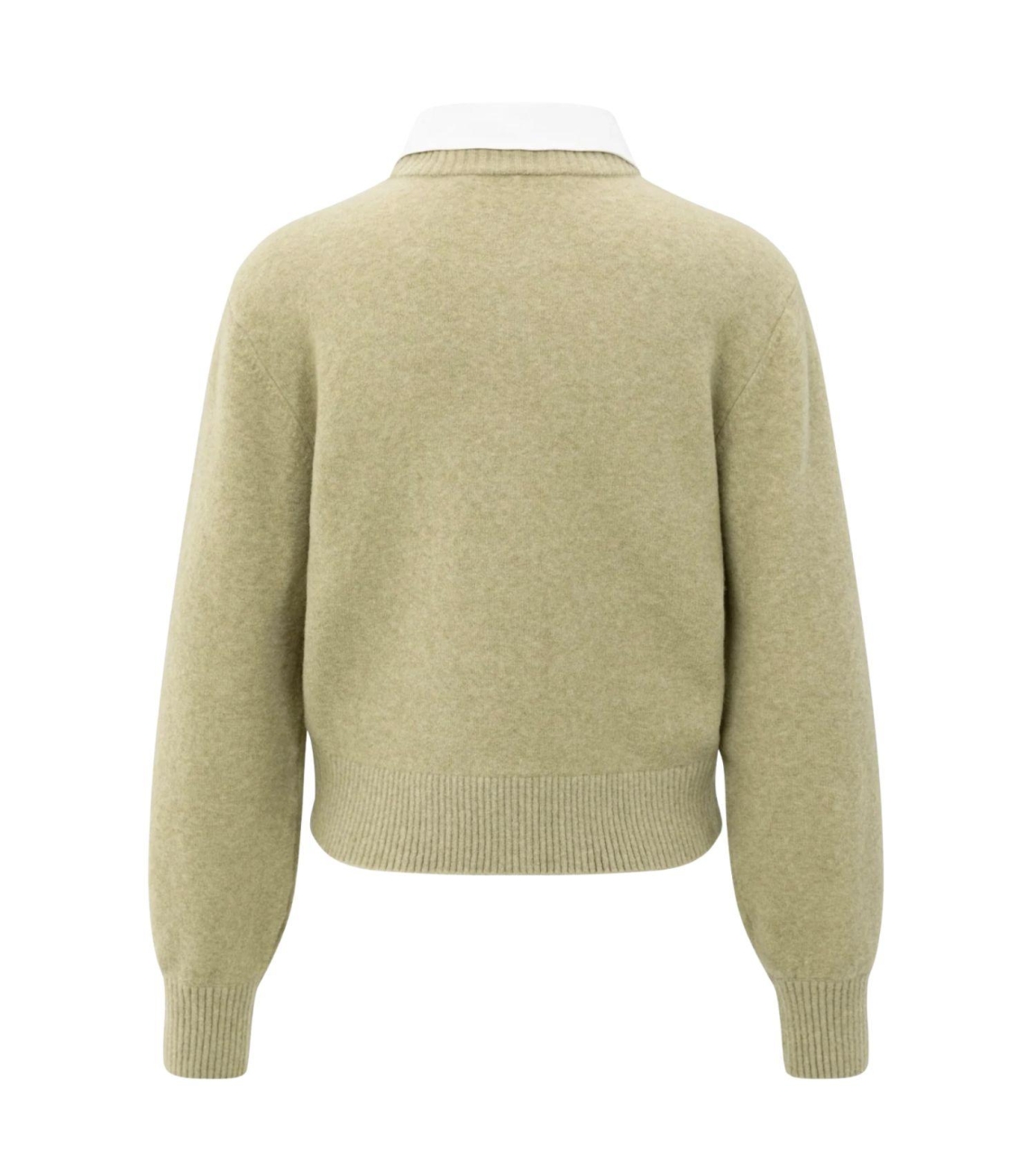 Yaya cardigan 01-010117-509. Dit rechtvallende model heeft een witte, afneembare kraag met daaronder een ronde halslijn en lange mouwen. Dit groene vest van Yaya sluit aan de voorzijde met knopen en is afgewerkt met ribgebreide boorden.