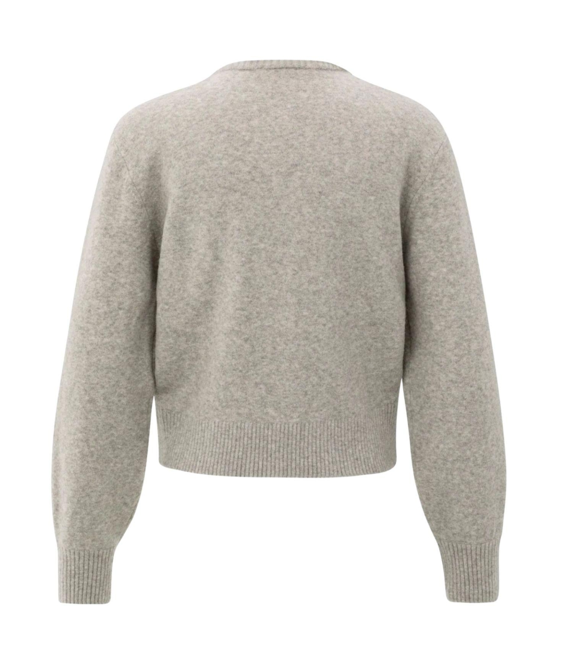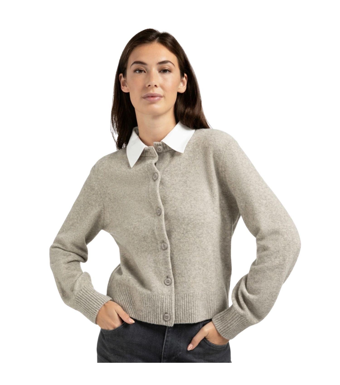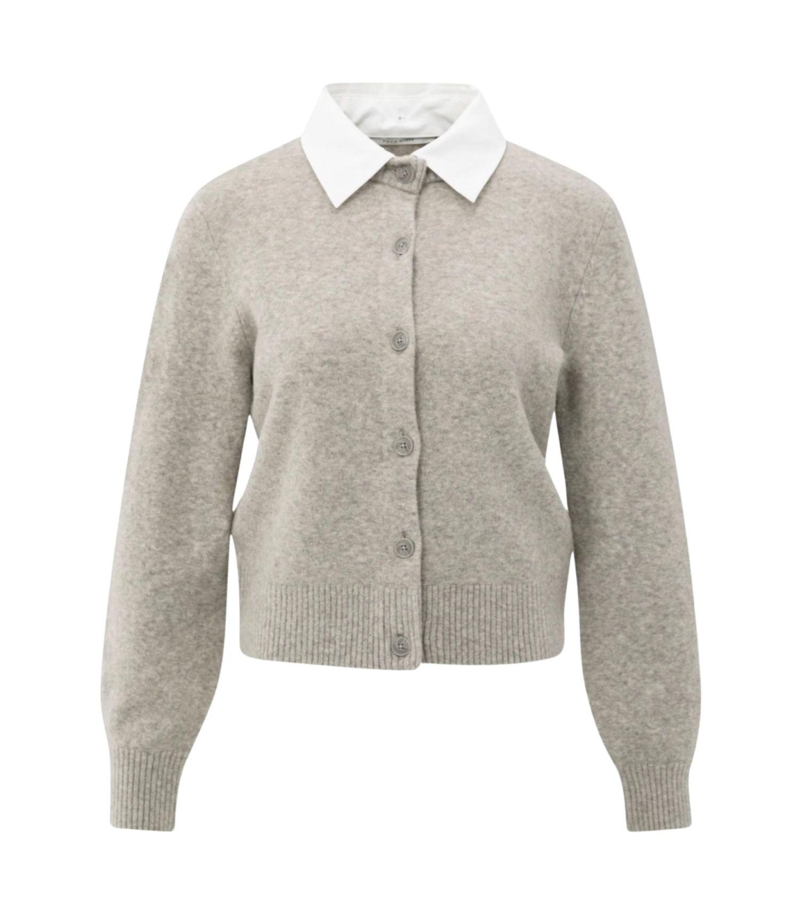 Yaya cardigan 01-010117-509. Dit rechtvallende model heeft een witte, afneembare kraag met daaronder een ronde halslijn en lange mouwen. Dit grijze vest van Yaya sluit aan de voorzijde met knopen en is afgewerkt met ribgebreide boorden.