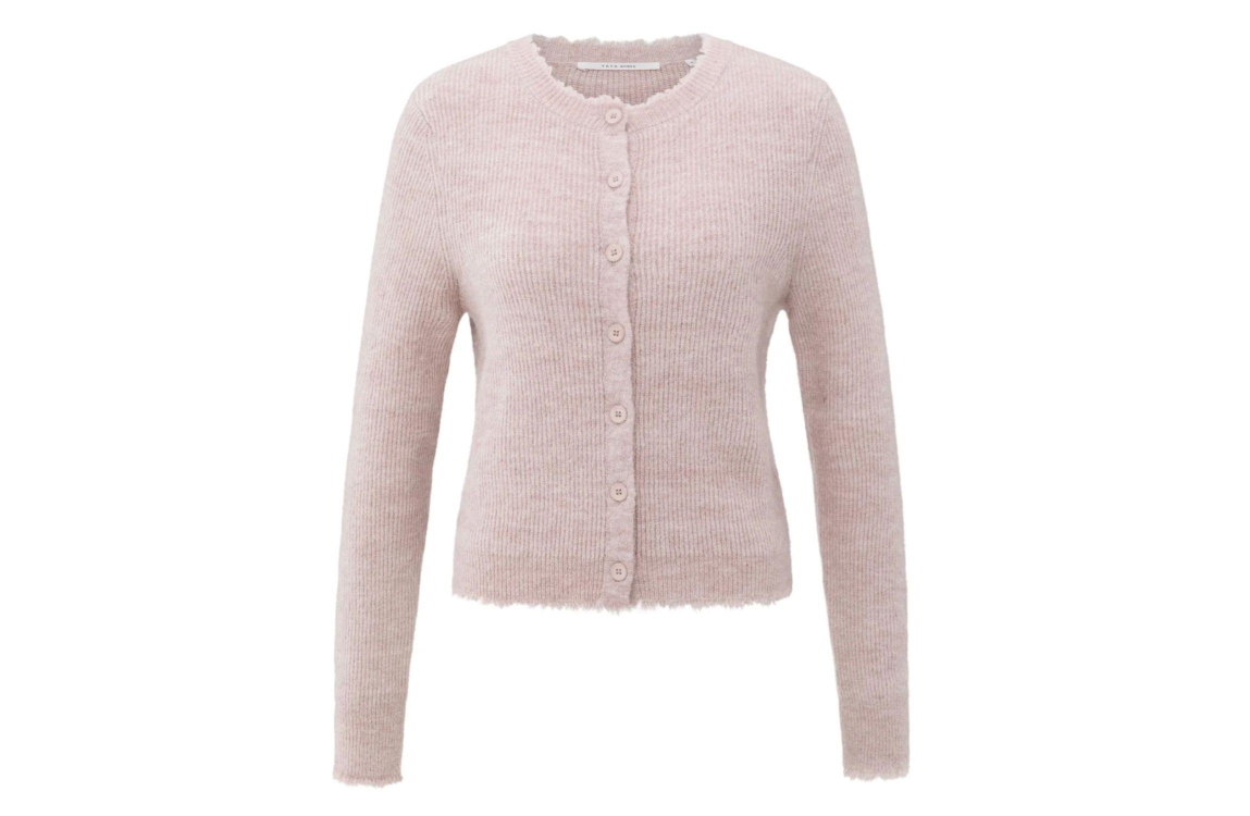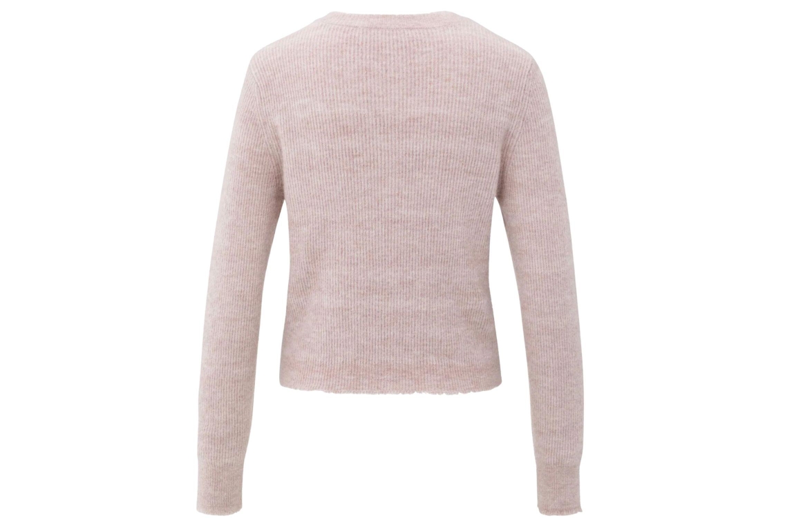 Yaya cardigan 01-010137-510 615092. Dit rechtvallende model heeft een ronde halslijn en lange mouwen. Deze lichtroze cardigan sluit aan de voorzijde door middel van knopen en is all-over uitgevoerd in ribgebreide kwaliteit. Het model is gedetailleerd met ruffles bij de boorden.