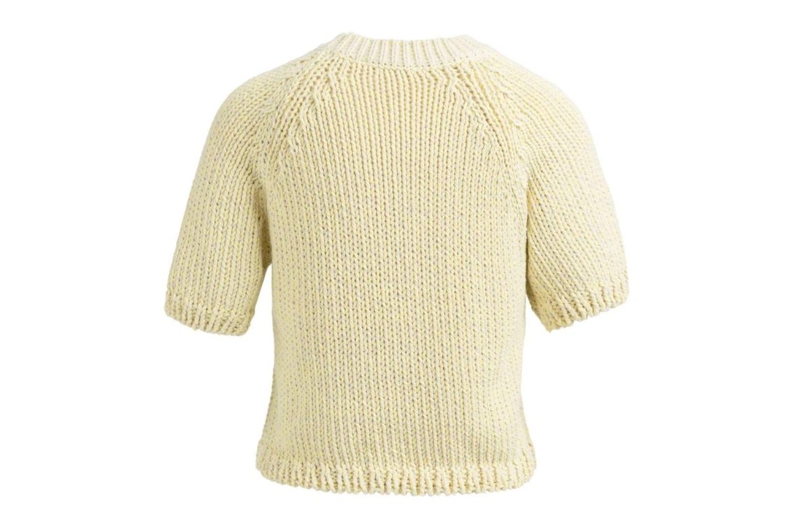 Yaya trui 01-000551-602 309151. Dit rechtvallende model heeft een ronde halslijn en korte mouwen. Deze geelkleurige trui van Yaya is uitgevoerd in grofgebreide kwaliteit en is afgewerkt met ribgebreide boorden.