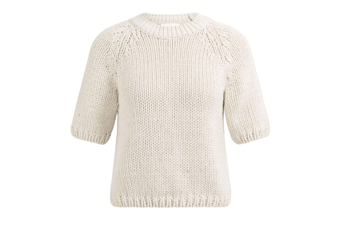 Yaya trui 01-000551-602 99044. Dit rechtvallende model heeft een ronde halslijn en korte mouwen. Deze beige trui van Yaya is uitgevoerd in grofgebreide kwaliteit en is afgewerkt met ribgebreide boorden.