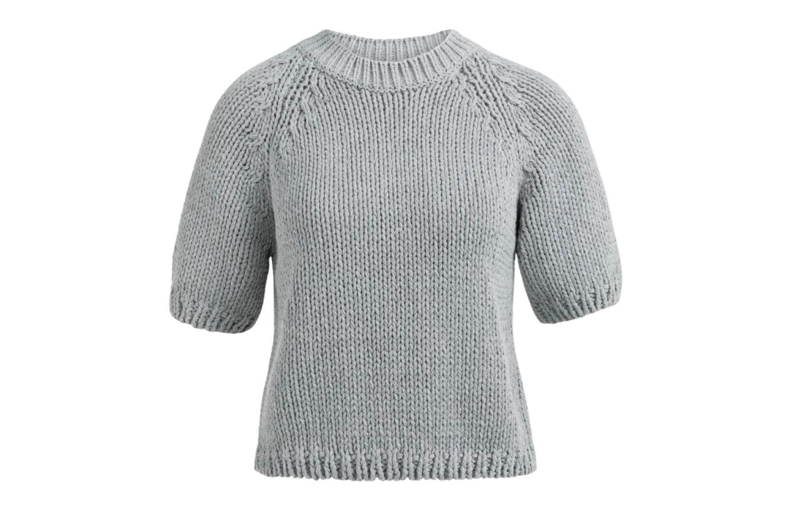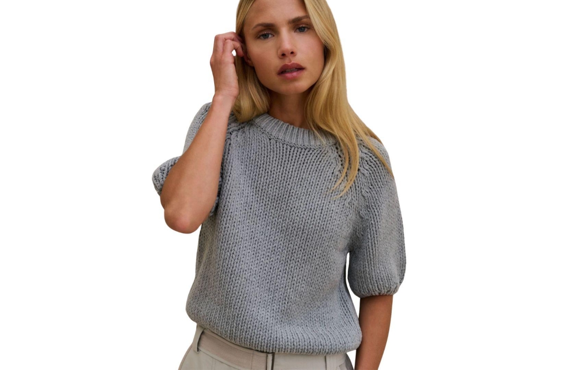 Yaya trui 01-000551-602 99047. Dit rechtvallende model heeft een ronde halslijn en korte mouwen. Deze grijze trui van Yaya is uitgevoerd in grofgebreide kwaliteit en is afgewerkt met ribgebreide boorden.