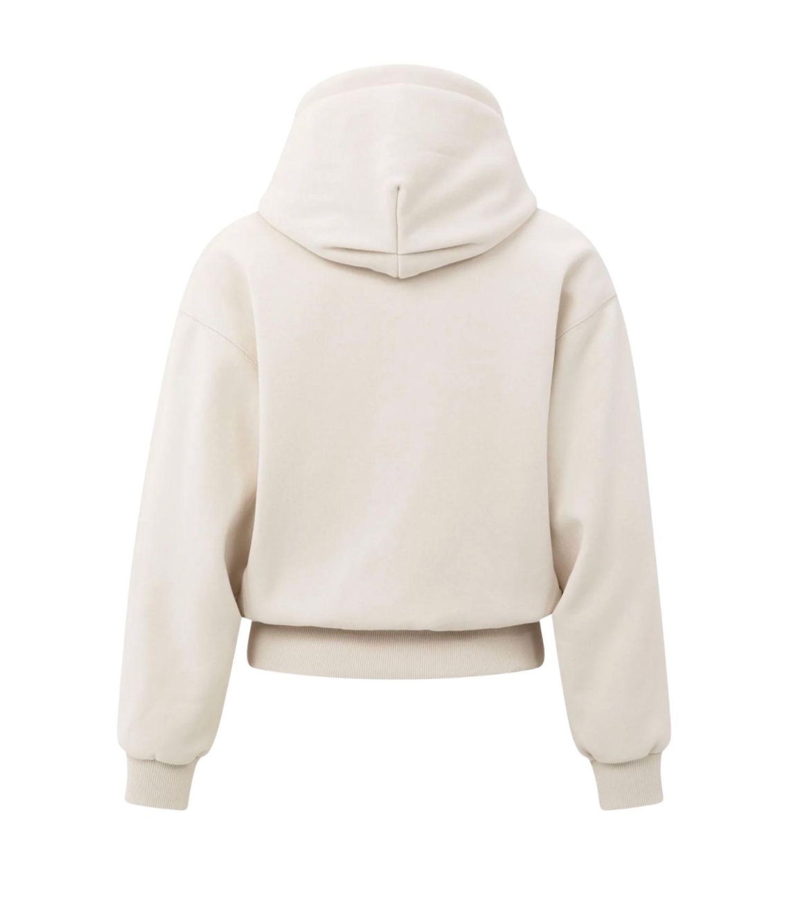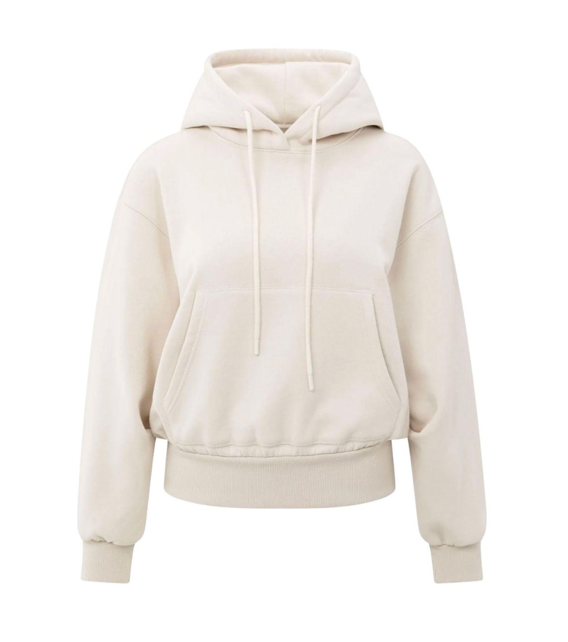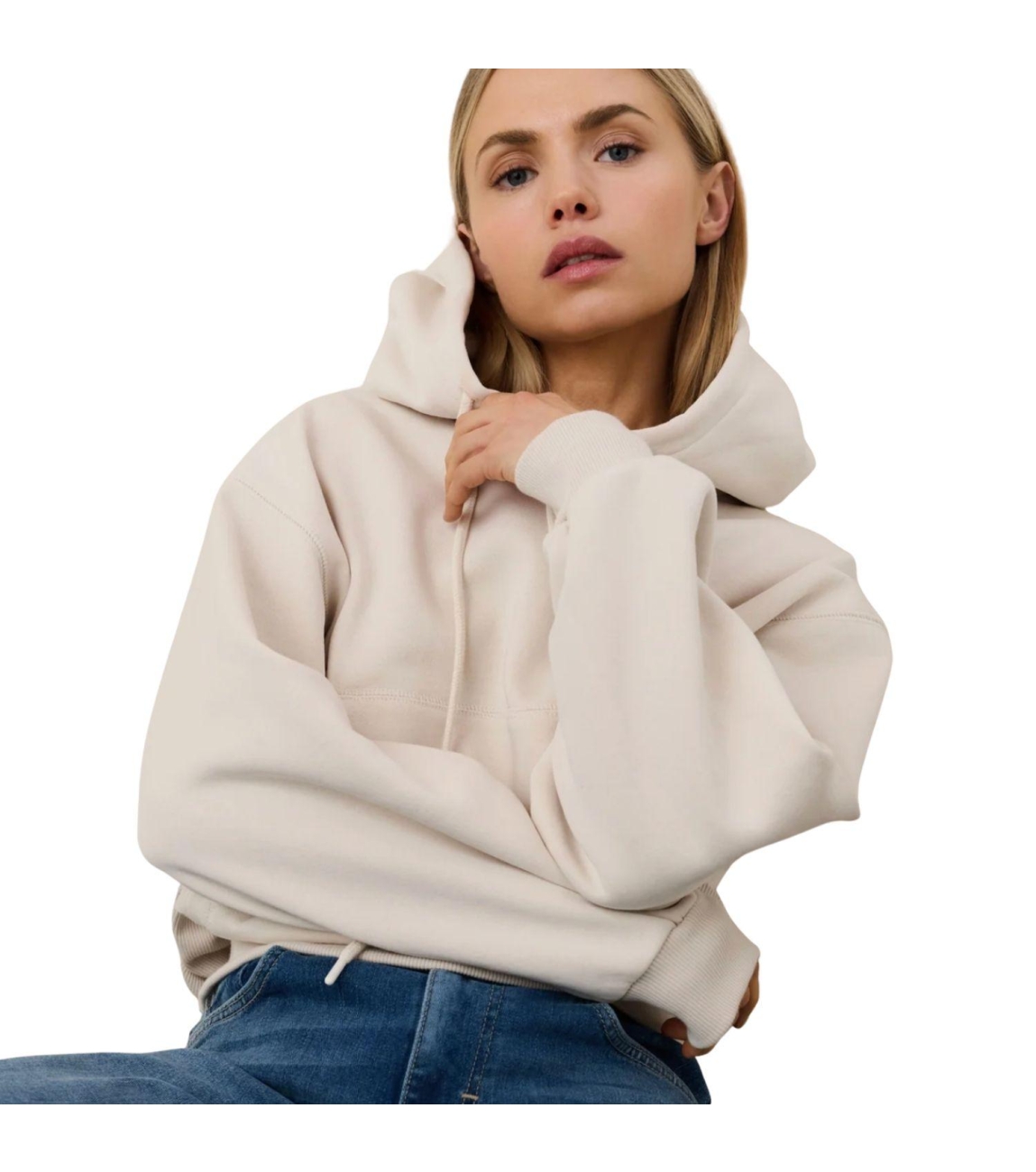 Yaya sweater 01-109095-509. Dit wijdvallende model heeft een capuchon met trekkoord en lange mouwen. Deze beige sweater van Yaya is op het voorpand gedetailleerd met een klassieke buidelzak en heeft ribgebreide boorden.