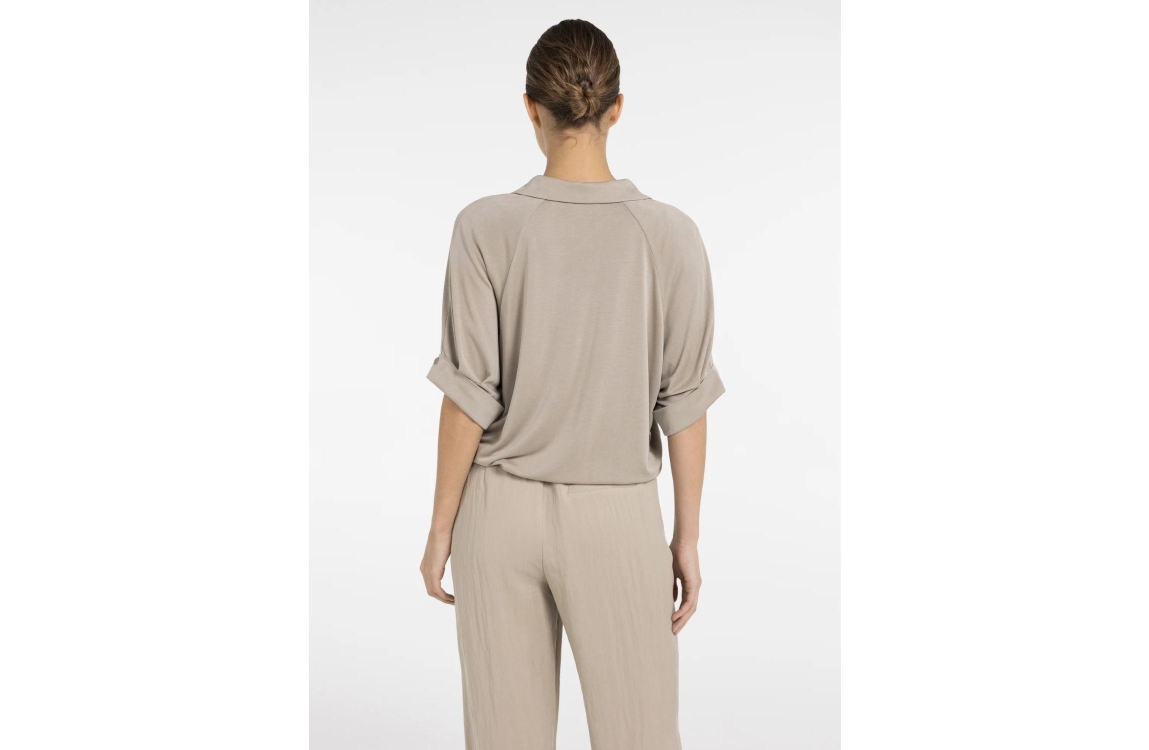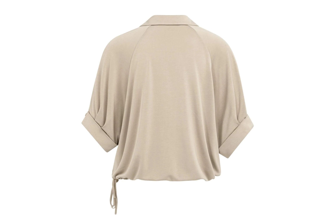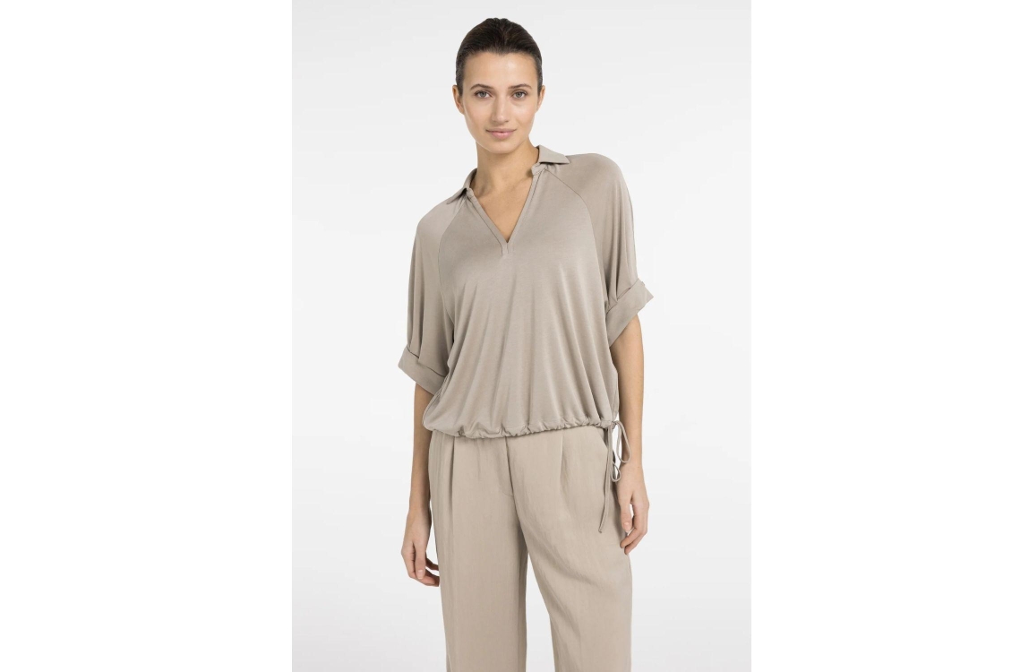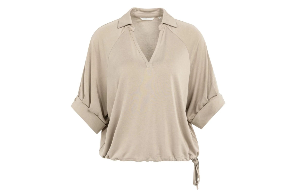 Yaya Jersey top with pleated sleeve 61104 Crockery brown. Dit soepelvallende model is voorzien van een V-hals en heeft korte mouwen met subtiele plooidetails. Deze beige/bruine top van Yaya is afgewerkt met een koorddetail in de zoom.