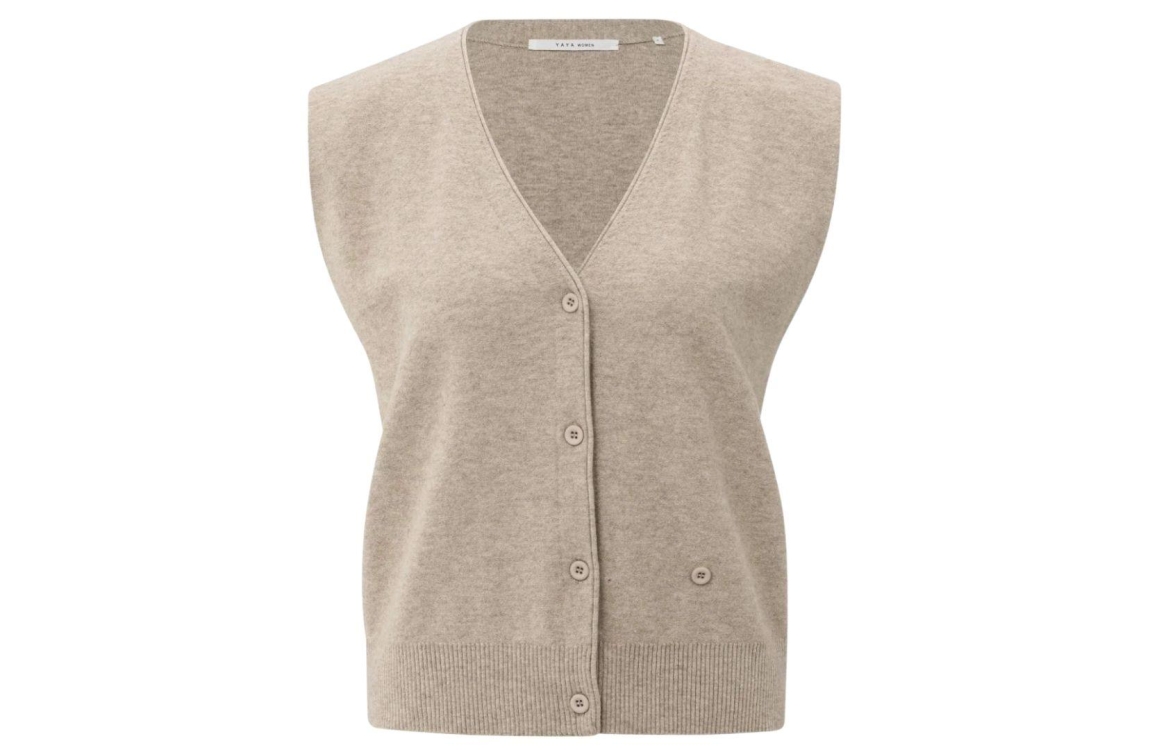 YAYA gilet 01-010120-508. Dit rechtvallende model heeft een diepe V-hals en is mouwloos. Deze zandkleurige gilet van YAYA is gedetailleerd met asymmetrische knoopsluitingen en heeft een brede ribgebreide zoom.