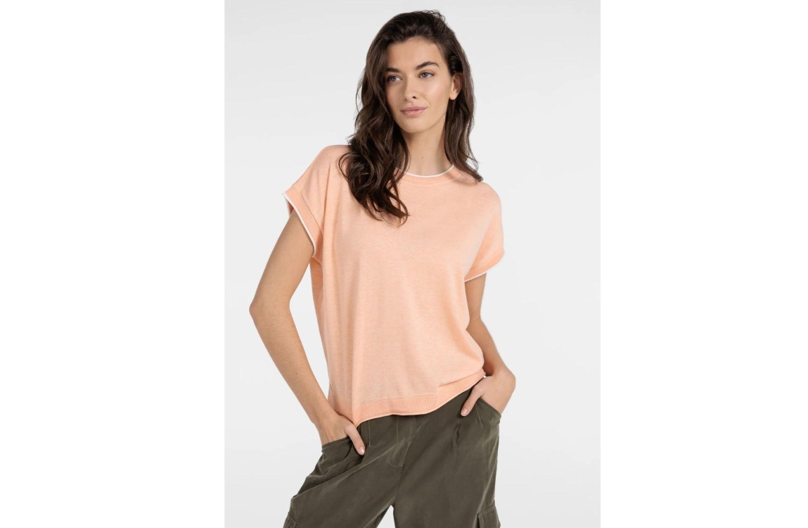 Yaya Knitted sweater with rolled ed 3103072 Peach palazzo orange mel. Dit rechtvallende model is voorzien van een ronde hals en heeft korte mouwen met contrasterende boorden. Deze oranje top van Yaya is afgewerkt met een subtiel verticaal structuurdetail op de rug.
