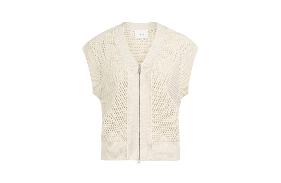 Yaya mesh stitch sleeveles cardigan 01-010154-604. Dit rechtvallend model is mouwloos en heeft een v-hals. Dit beige grofgebreide vest van Yaya sluit door middel van een dubbele rits en is opengewerkt uitgevoerd.