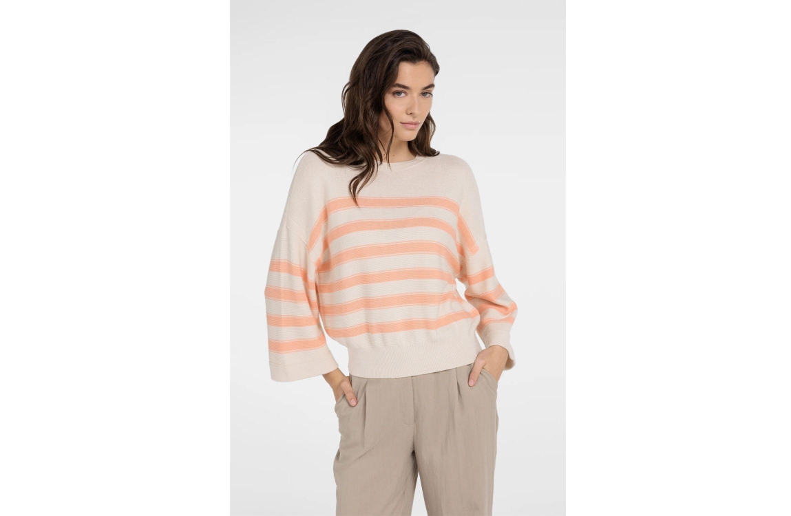 Yaya Mixing textured sweater with s 313072 Peach palazzo orange mel. Dit soepelvallende model is voorzien van een ronde hals en heeft verlaagde schouders en rechte, wijde mouwen. Deze beige sweater van Yaya is bewerkt met een oranje streepdessin. Dit model is afgewerkt met ribboorden aan de zoom en mouwen.