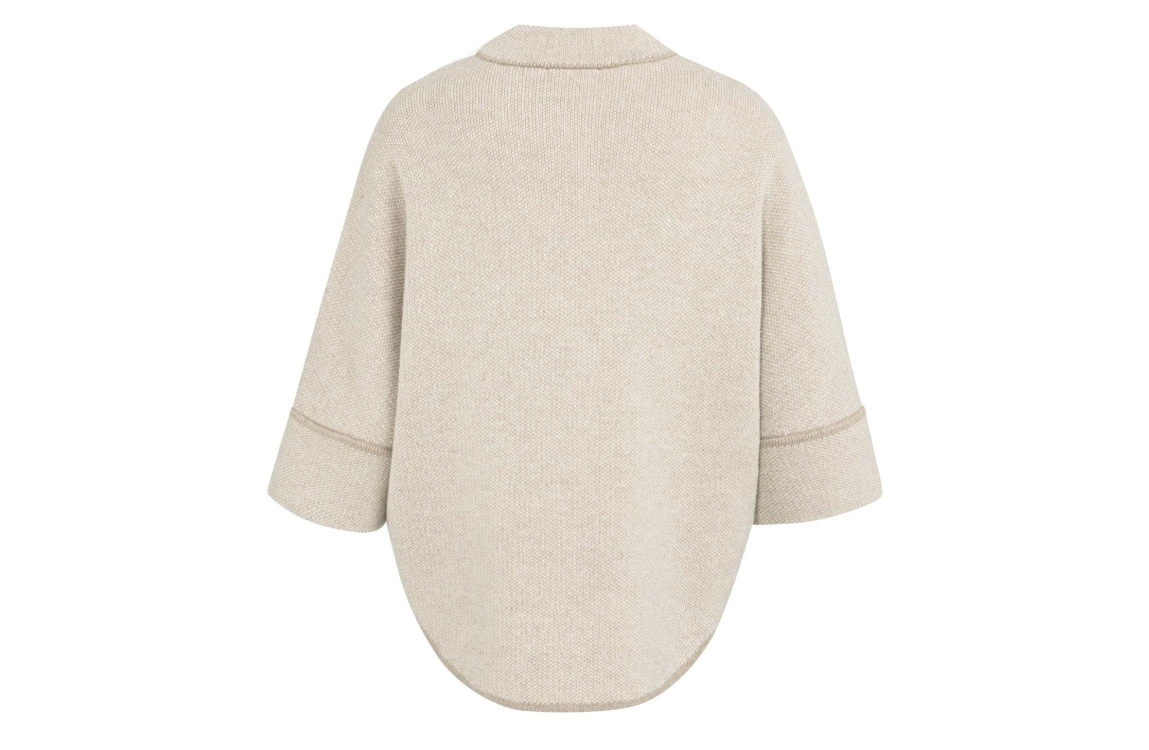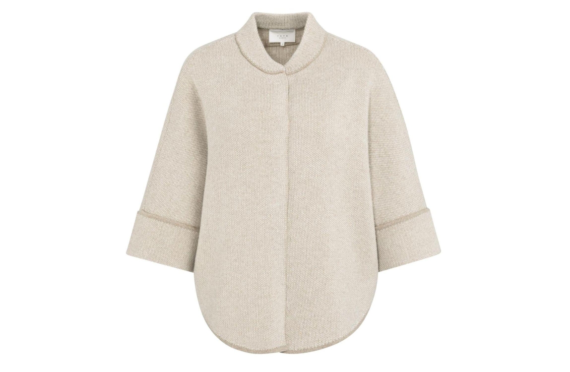 Yaya Poncho-vest met ronde zoom 513061 Oxford tan brown. Dit wijdvallende model is voorzien van een rond kraag en driekwart mouwen. Deze beige poncho van Yaya heeft een oversized pasvorm met ronde zoom en sluit door middel van een drukknoop sluiting.