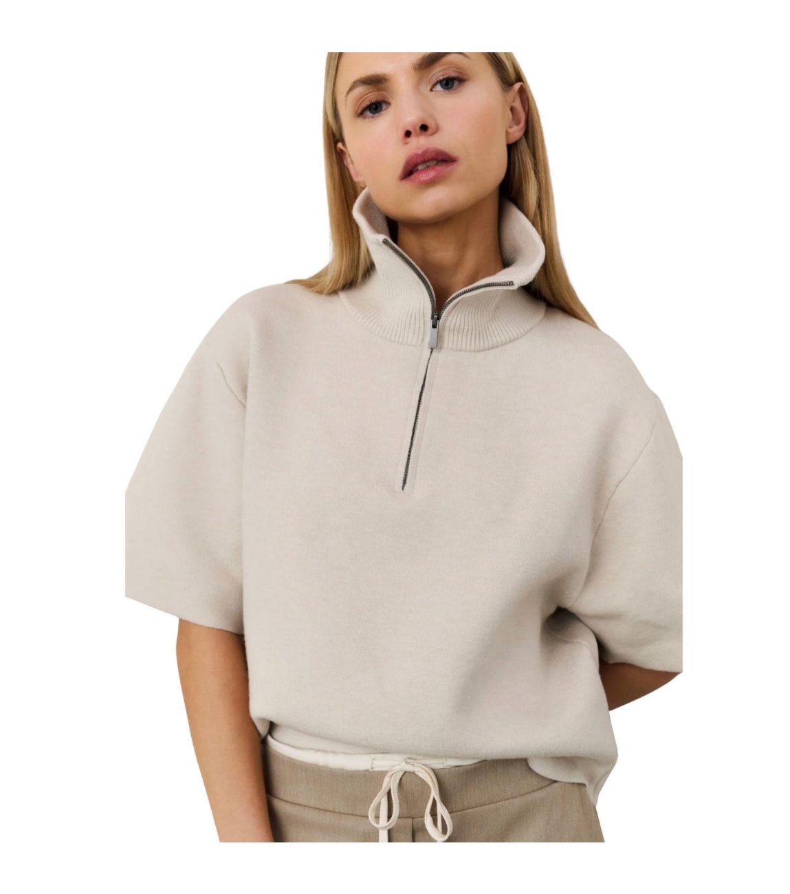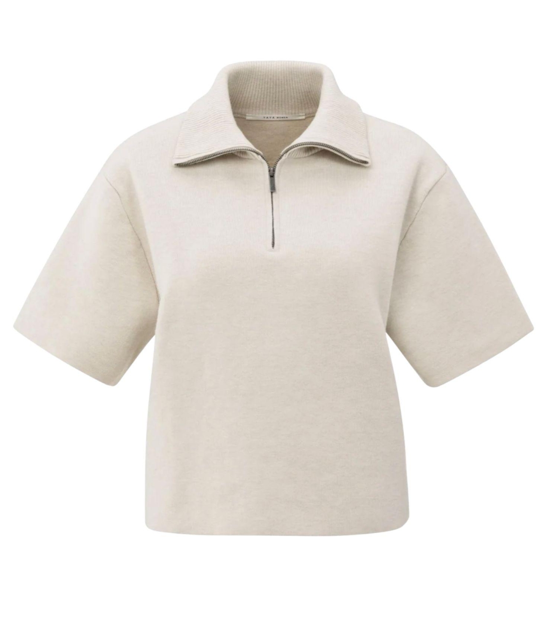 Yaya sweater 01-000490-509. Dit soepelvallende model heeft een hoge kraag met ribstructuur en korte mouwen. Deze beige (chalk white) sweater van Yaya is uitgevoerd in stretchkwaliteit en is voorzien van een ritssluiting bij de hals.