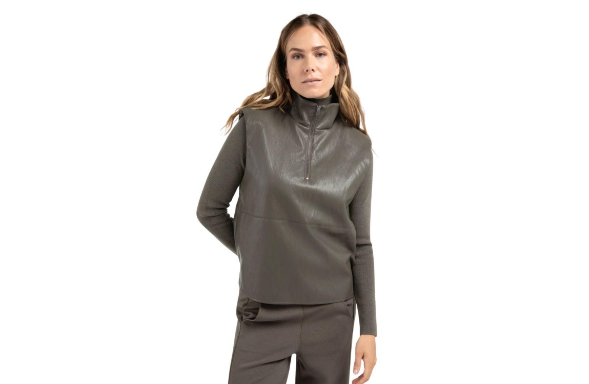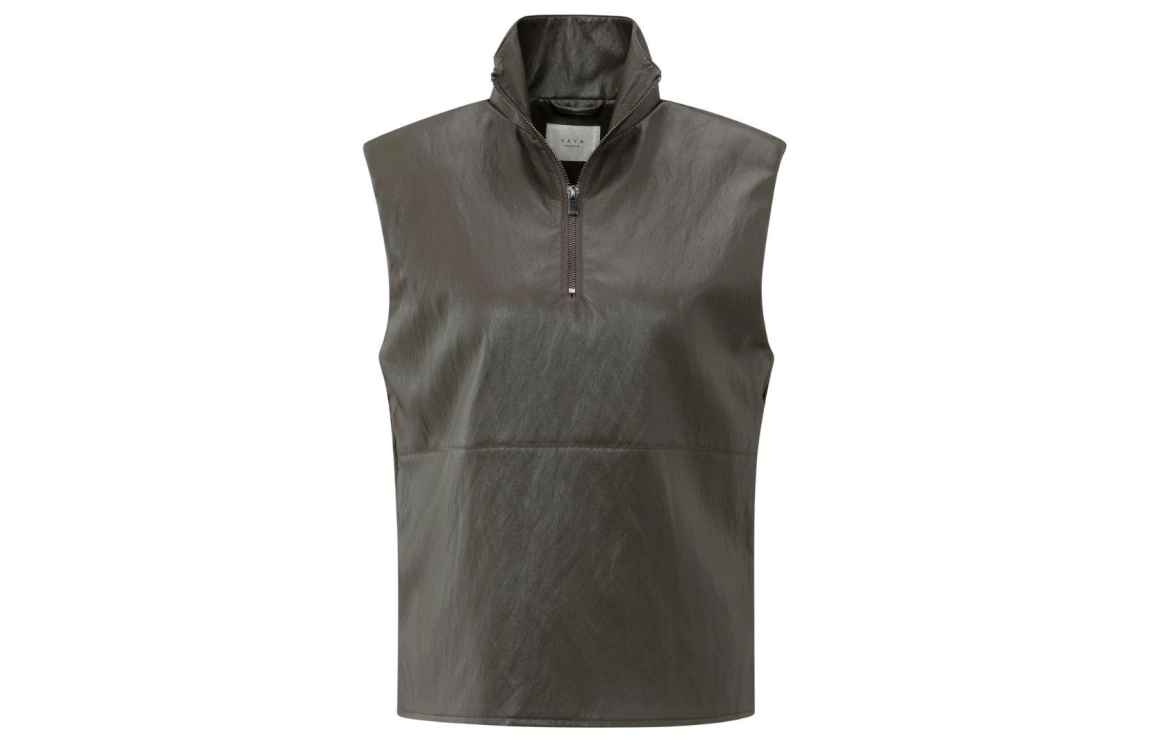 Yaya top hirt01-029005-510. Dit rechtvallende model heeft een opstaande kraag en is mouwloos. Deze grijze top van Yaya sluit aan de voorzijde door middel van een rits en is uitgevoerd in een leren-look.