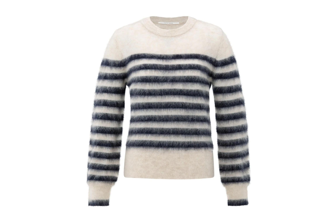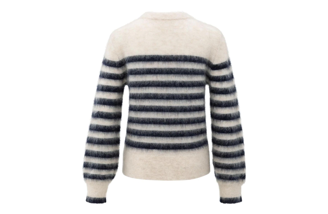 Yaya Striped sweater 940511 Collegiate blue dessin. Dit rechtvallende model is voorzien van een ronde hals en heeft lange mouwen. Deze beige met donker blauw gestreepte trui van Yaya is gemaakt van een warme wolmix.