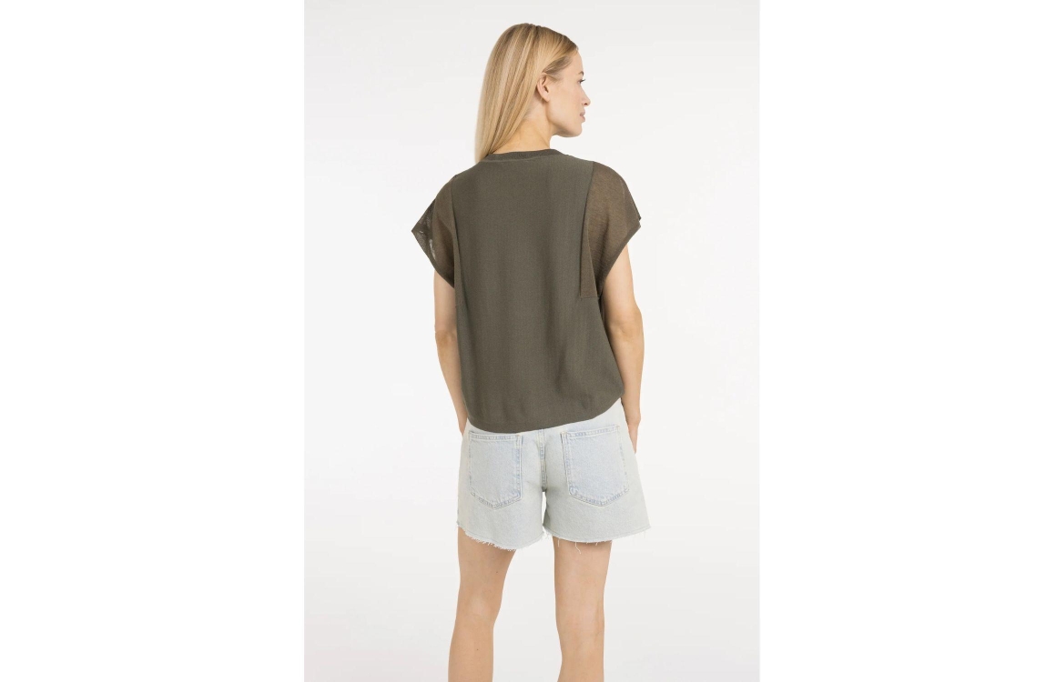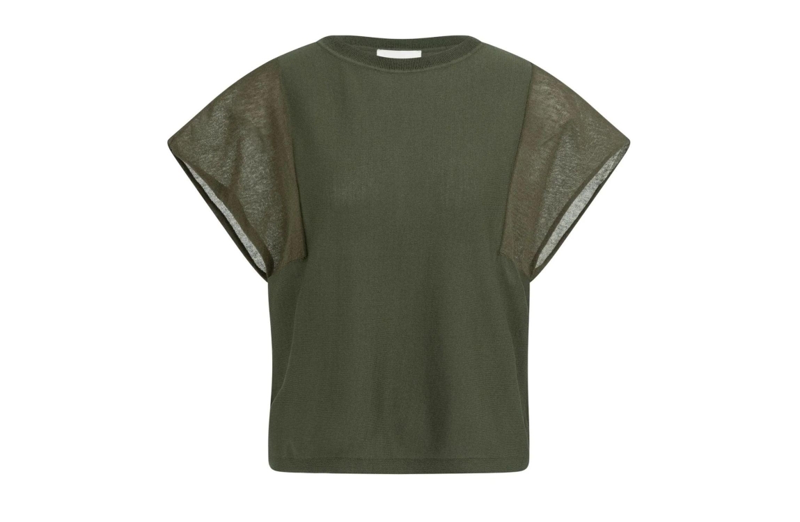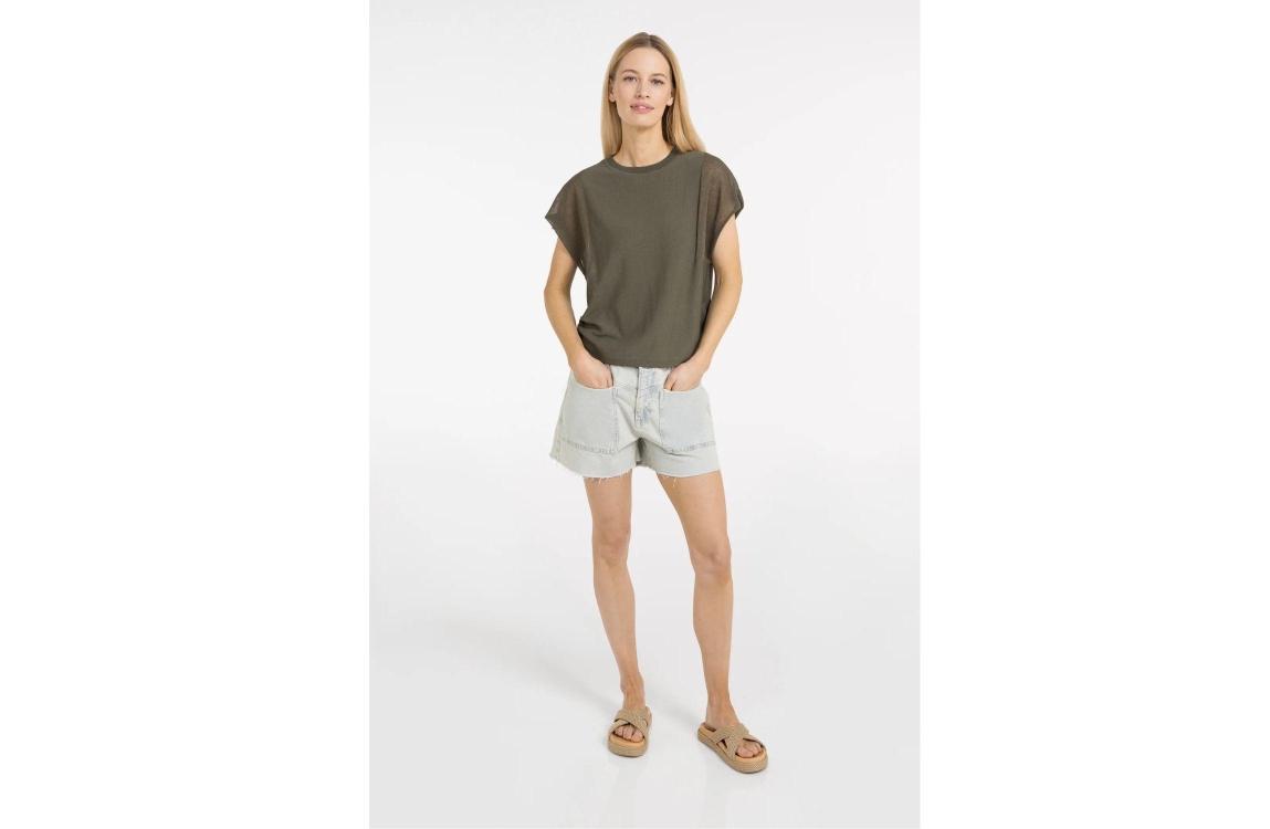 Yaya Sweater with transparent short 99065 Army. Dit rechtvallende model is voorzien van een ronde hals en heeft korte transparante mouwen. Deze groene top van Yaya is gemaakt van een comfortabele, zachte stof.