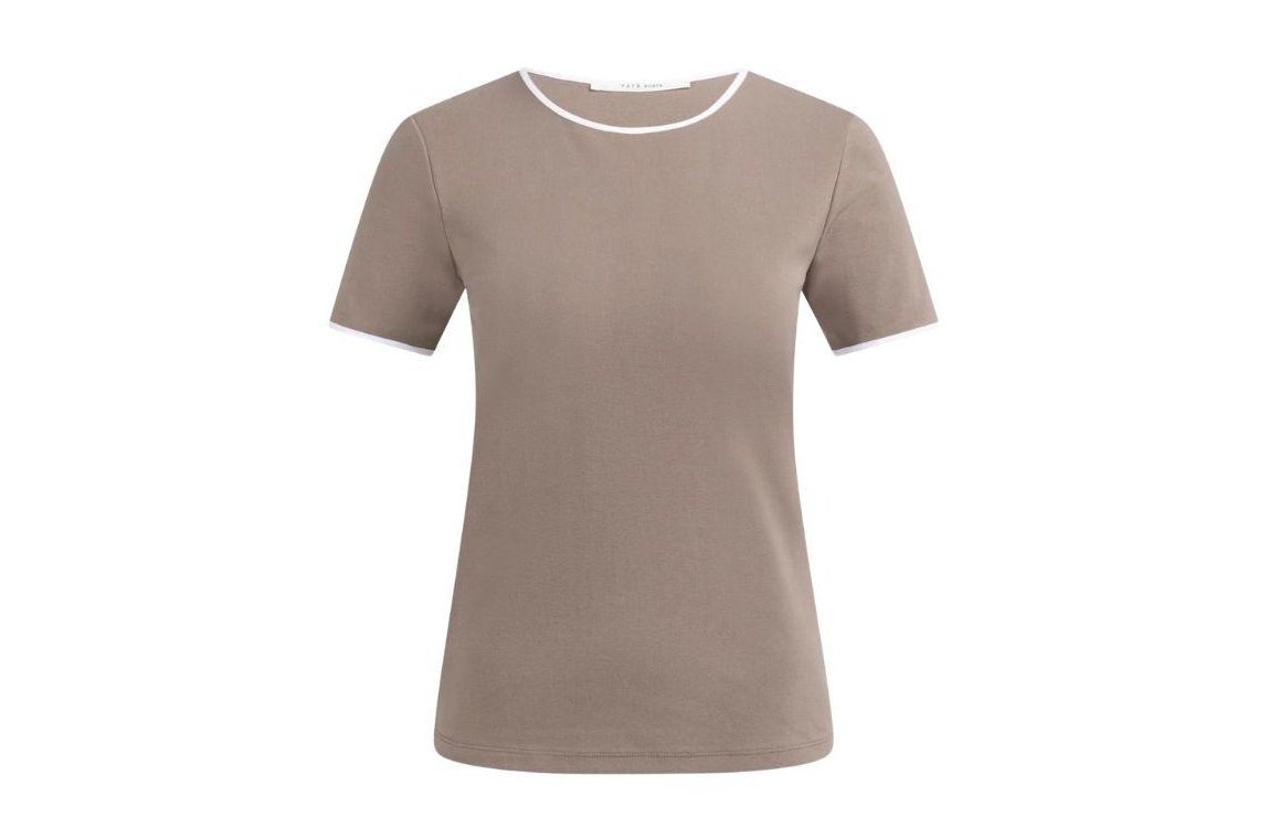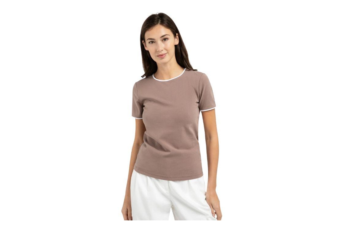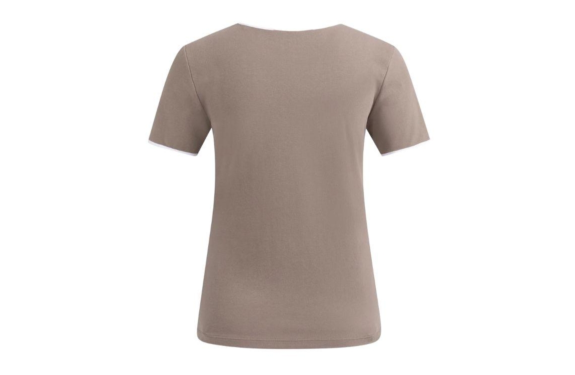 Yaya T-shirt 01-719084-603 81312. Dit licht aangesloten model heeft een ronde halslijn en korte mouwen. Deze bruine T-shirt van Yaya is uitgevoerd in stretchkwaliteit en is afgewerkt met een witte contrastbies bij de hals en de mouwen.