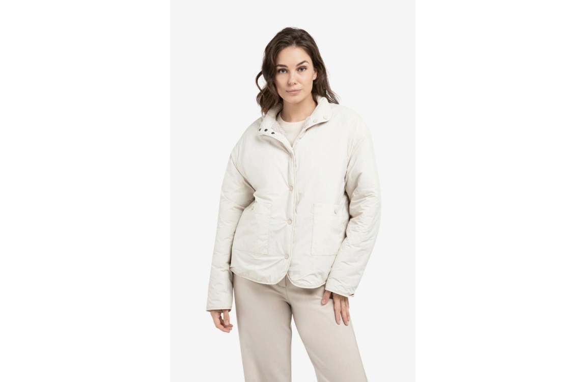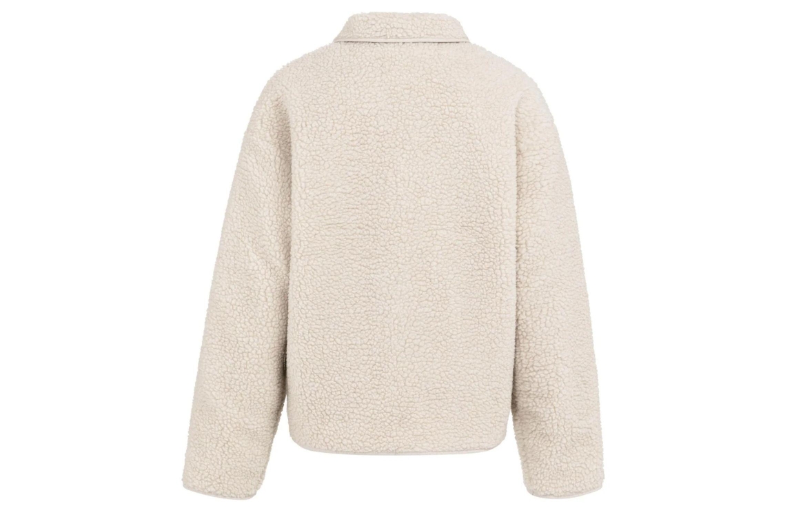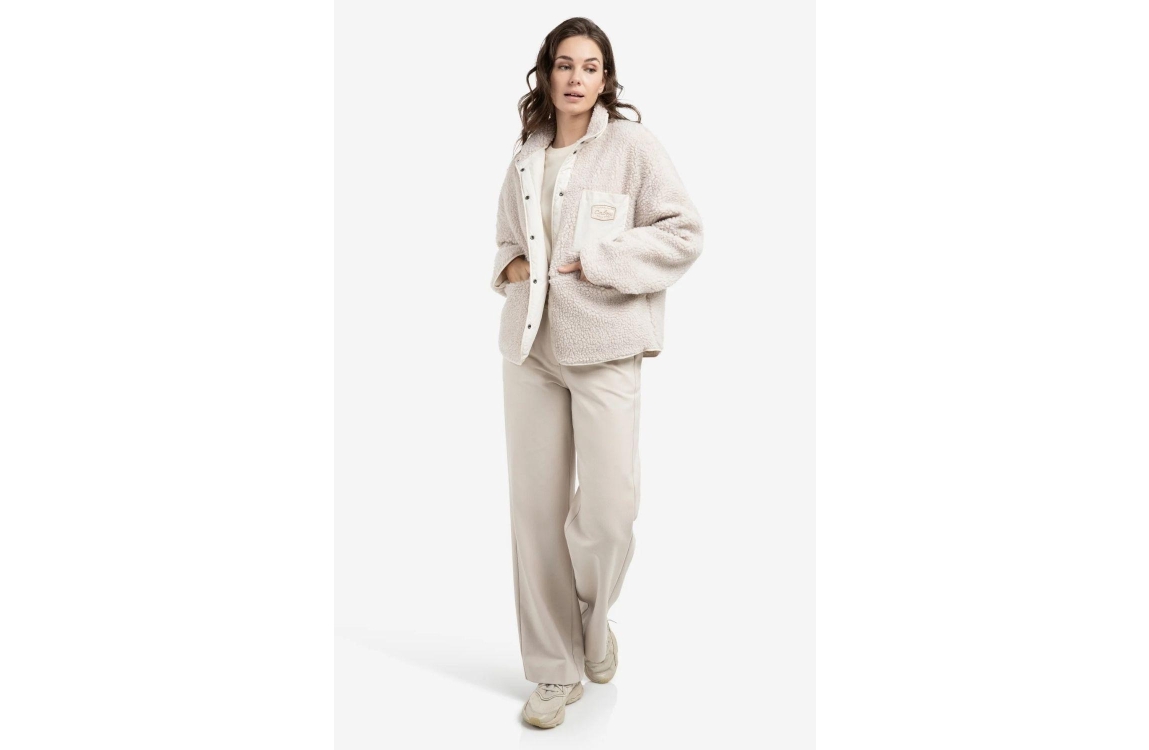 Yaya Teddy jack met nylon borstzak 990402 Heather grey mel. Dit rechtvallende model is voorzien van een opstaande kraag en heeft lange mouwen. Deze omkeerbare beige teddy jas van Yaya sluit aan de voorzijde door middel van een drukknoop sluiting en is afgewerkt met een borstzakje met tekst op de borst. Dit model heeft een teddy buitenzijde en een gladde binnenzijde.