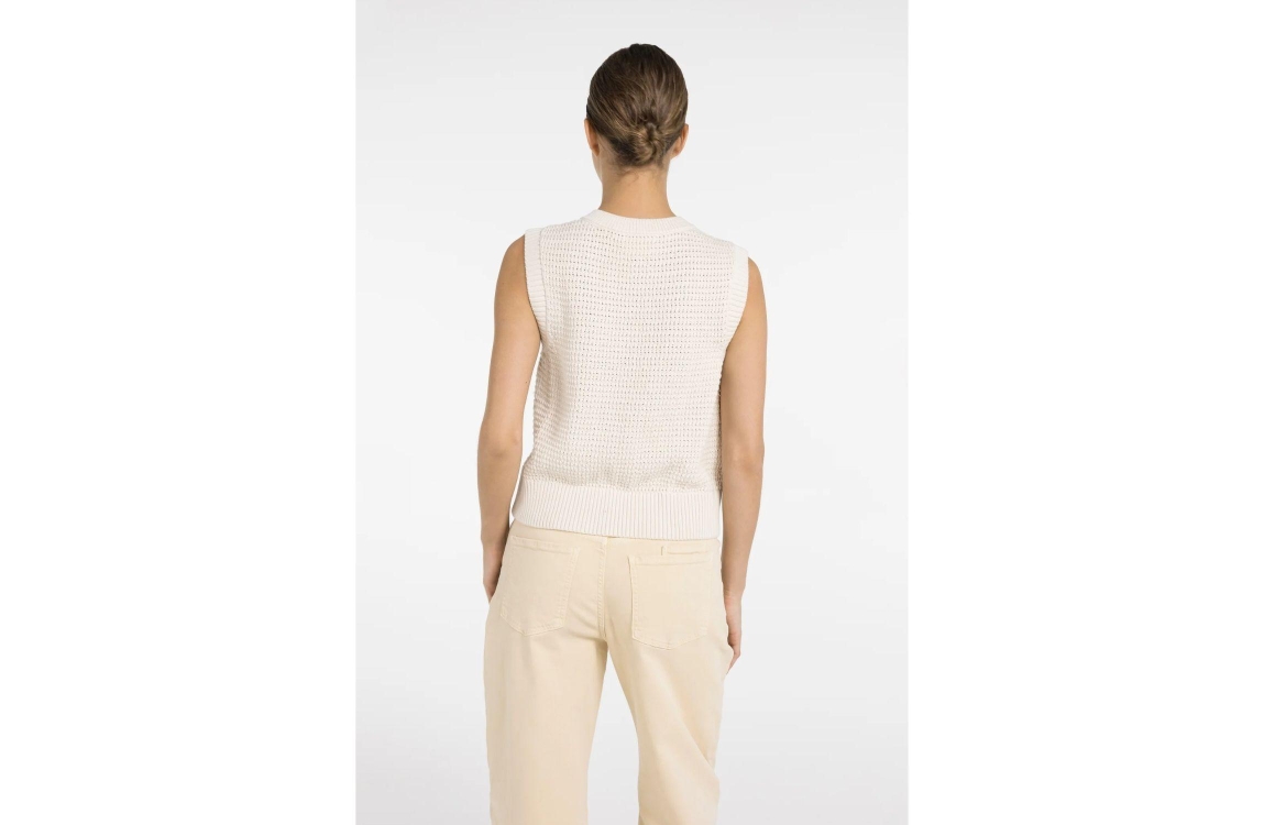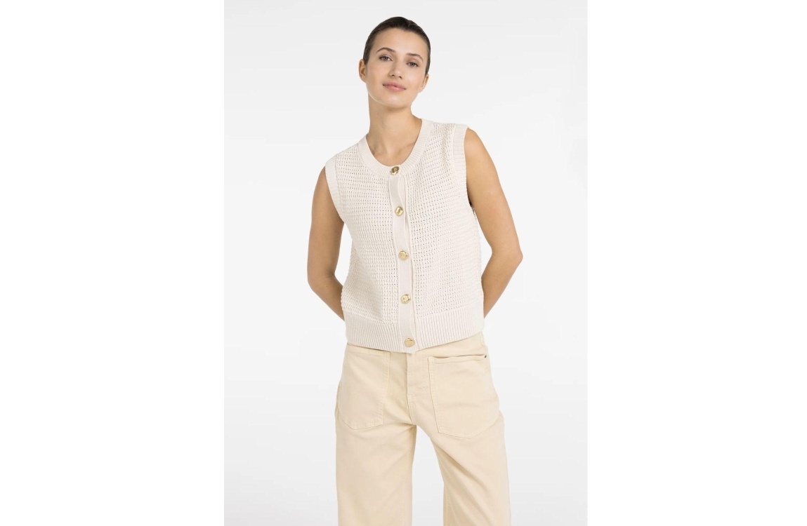 Yaya Textured sleeveless cardigan w 99058 Creme beige. Dit rechtvallende model is voorzien van een ronde hals en is mouwloos. Deze beige top van Yaya is gemaakt van een grofgebreide structuur en sluit door middel van goudkleurige knopen aan de voorzijde.