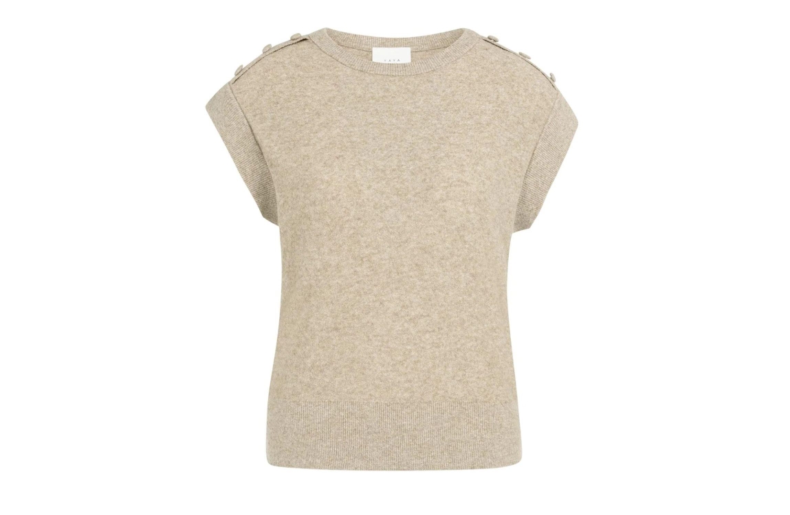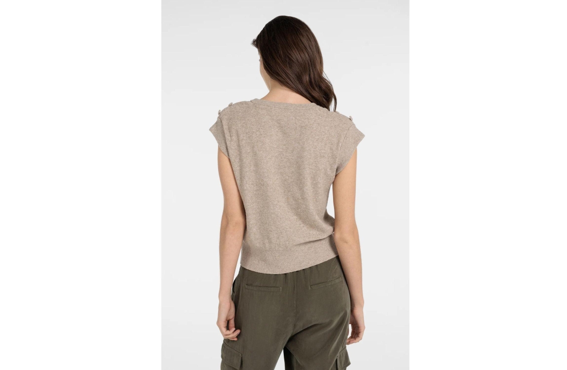 Yaya Towel knit sleeveless sweater 611404 Crockery brown. Dit rechtvallende model is voorzien van een ronde hals en is mouwloos. Deze bruine top van Yaya is afgewerkt met ribboorden. Dit model is bewerkt met knoopdetails op de schouders.