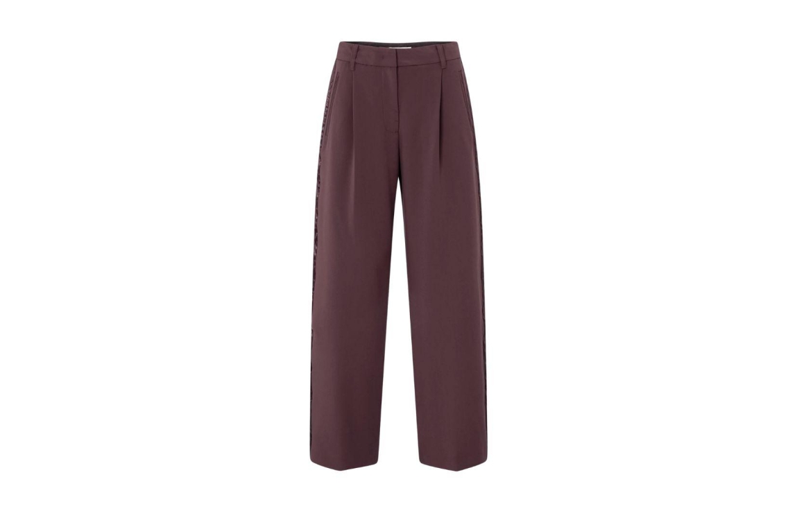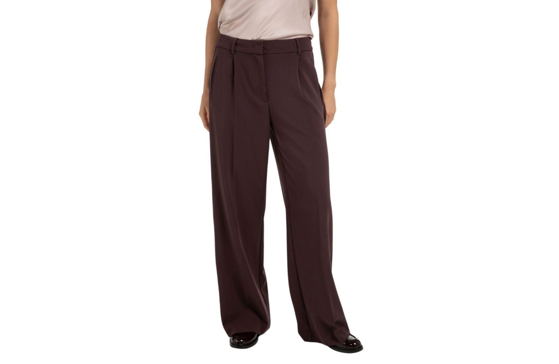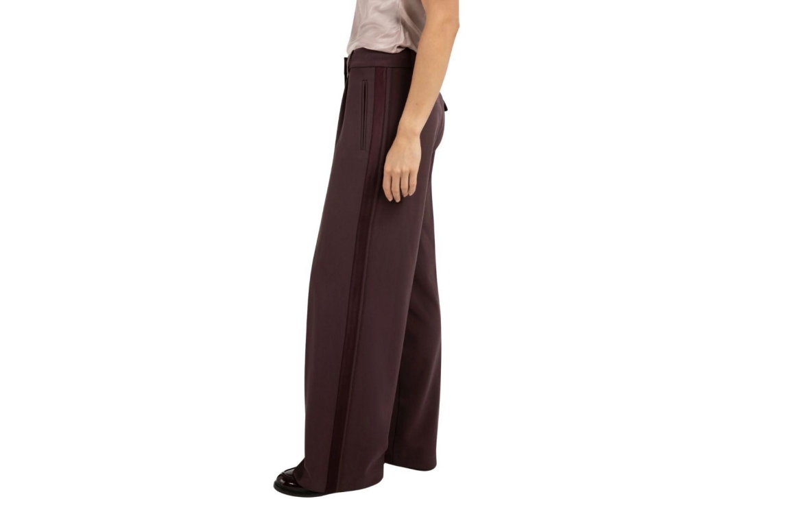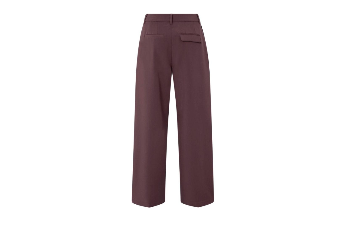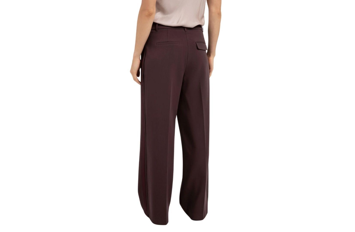 Yaya broek 01-301230-511. Dit wide leg model sluit door middel van een knoop en rits afgewerkt met ceintuurlussen. Deze bordeauxrode broek van Yaya is voorzien van twee steekzakken aan de voorzijde en twee paspelzakken aan de achterzijde. Dit model is bewerkt met biezen aan de zijkant uitgevoerd in een satijnen kwaliteit.