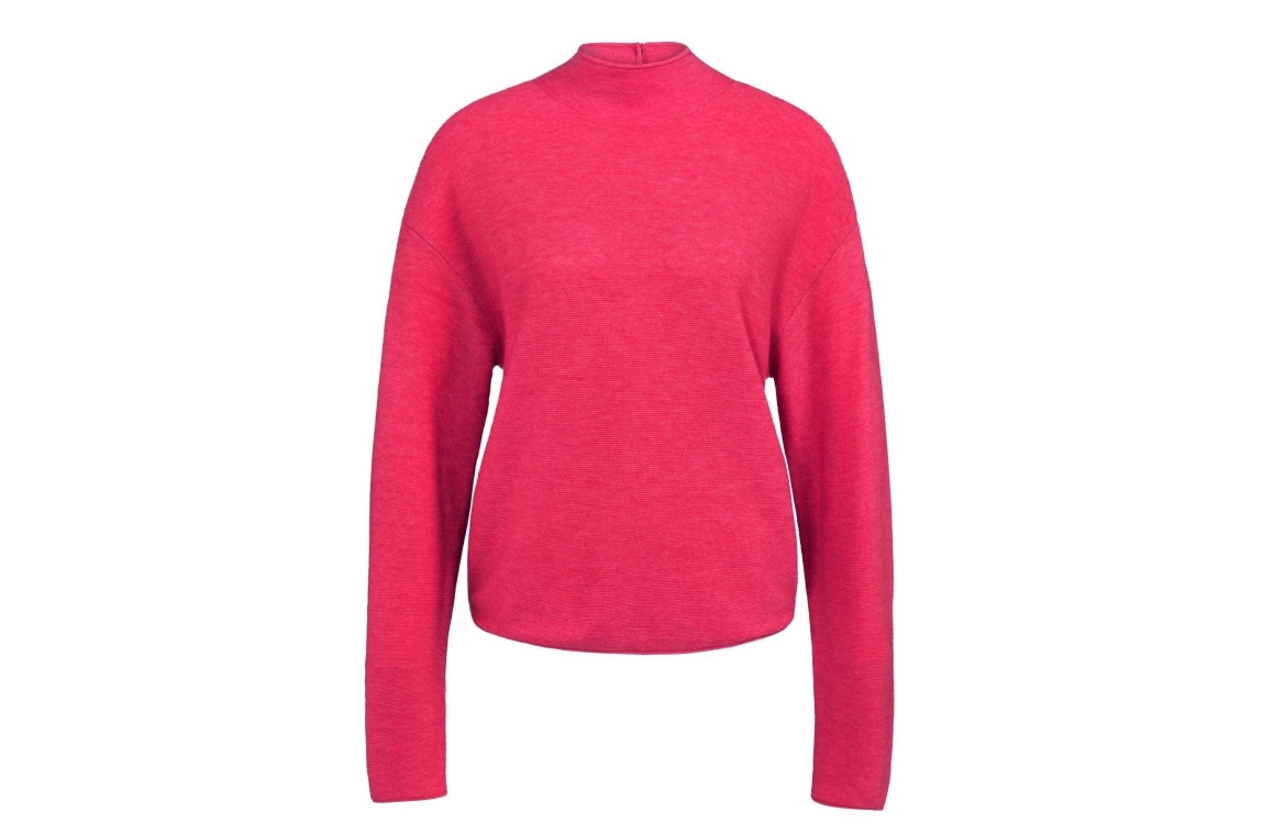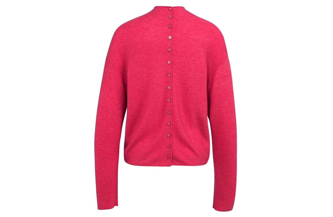 Yaya Trui met knopen op de rug 818522 Rose red mel. Dit regular fit model heeft een opstaande hals en lange mouwen. Deze rood/roze trui van Yaya sluit op de rug door middel van knopen.