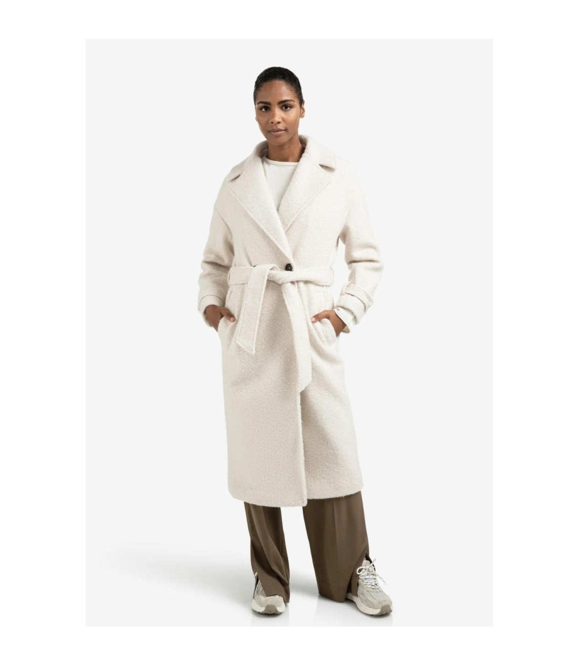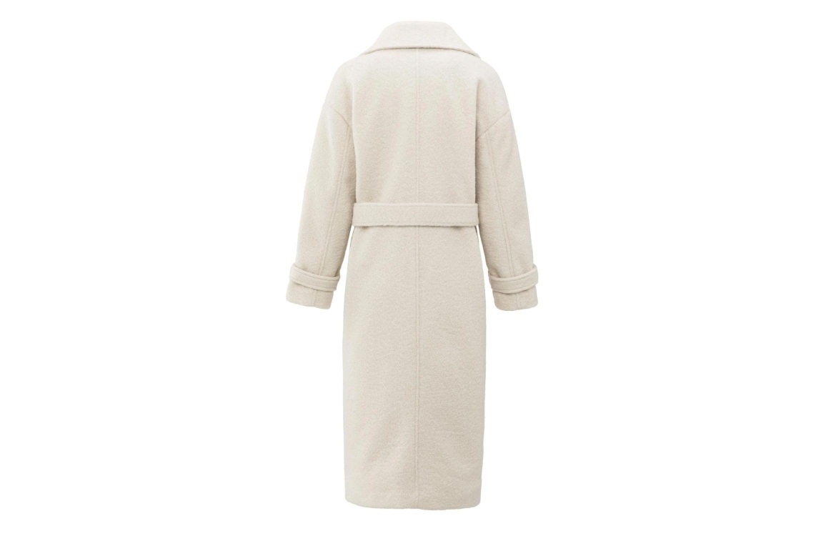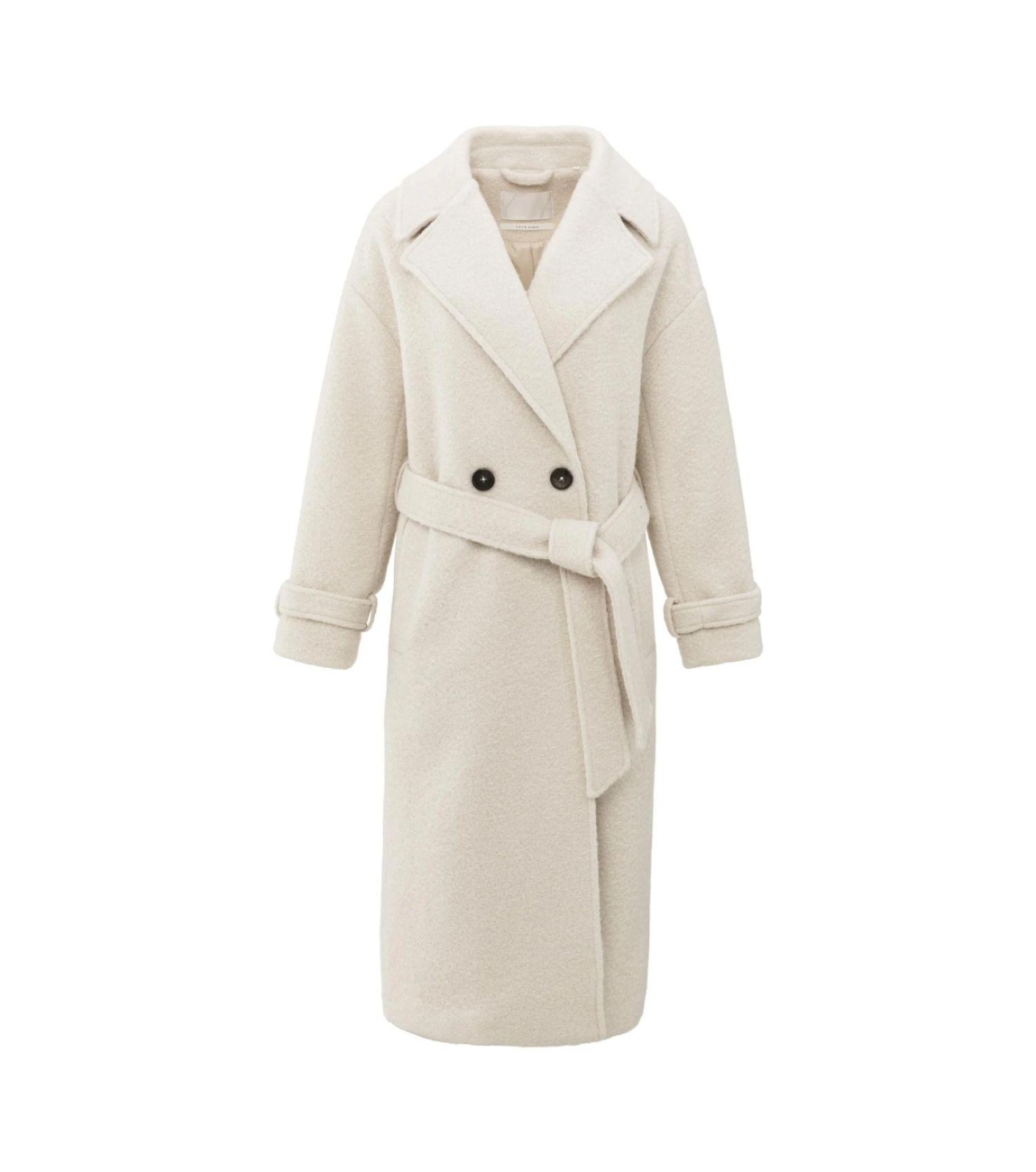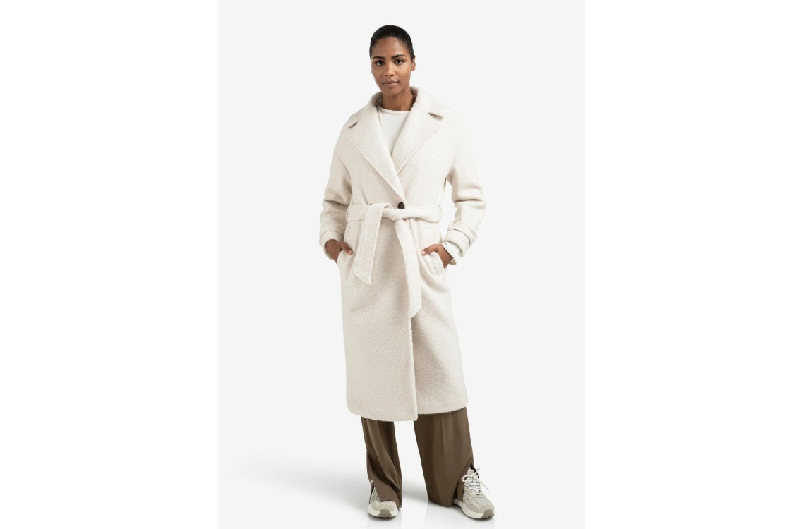 Yaya Woven boucle long length overs 99005 Chalk white. Dit rechtvallende model heeft een reverskraag en lange mouwen. Deze off-white bouclé jas van Yaya beschikt aan twee steekzakken aan de voorzijde en sluit door middel van een dubbele knoopsluiting en een ceintuur om de middel.