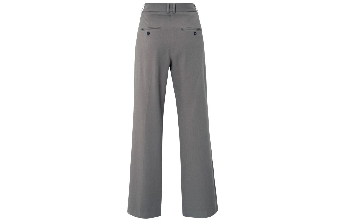 Yaya broek 01-301226-510 80307. Dit wide leg model sluit door middel van een knoop- en ritssluiting en is voorzien van ceintuurlussen. Deze donkergrijze broek van Yaya is voorzien van twee steekzakken aan de voorzijde en twee paspelzakken aan de achterzijde. Het model is afgewerkt met plooidetails en is uitgevoerd in geweven stof.