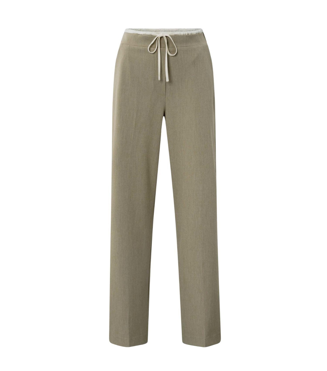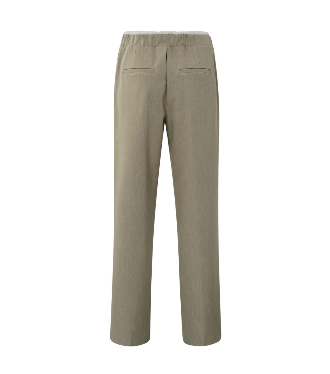 Yaya broek 01-301211-509. Dit loose fit model sluit met een witte elastische tailleband met trekkoord. Deze beige melange broek van Yaya is voorzien van twee schuine steekzakken aan de voorzijde en twee paspelzakken aan de achterzijde.