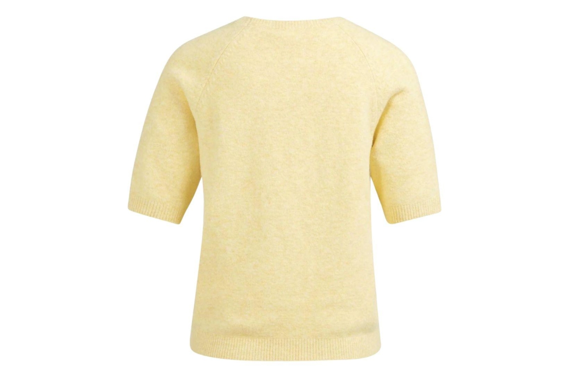 Yaya pullover 01-000458-602 990442. Dit rechtvallende model heeft een ronde halslijn en korte raglanmouwen. Deze geelkleurige pullover van Yaya is gemaakt van een gebreide stof en is afgewerkt met ribgebreide boorden.