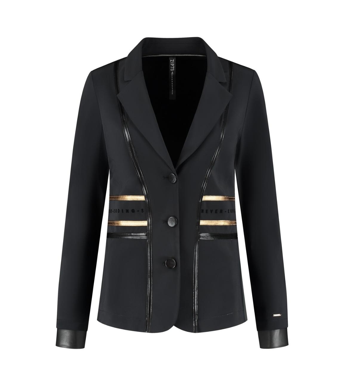 ZIP73 Blazer never ending W25/512/03/001. Het rechtvallend model heeft een kraag en lange mouwen. Deze zwarte blazer van Zip73 sluit door middel van knopen en is voorzien van leatherlook details en bronzen accenten.